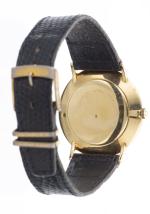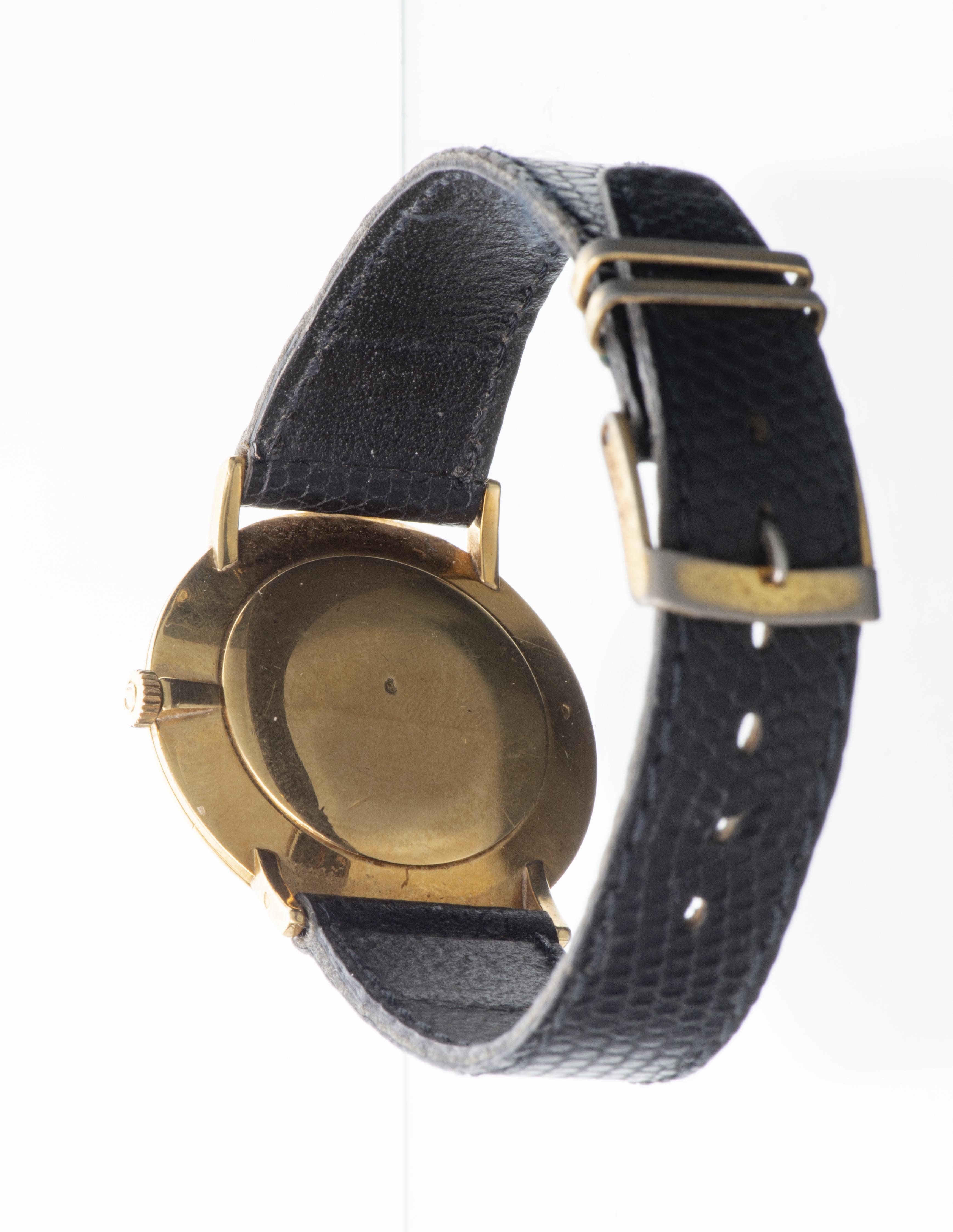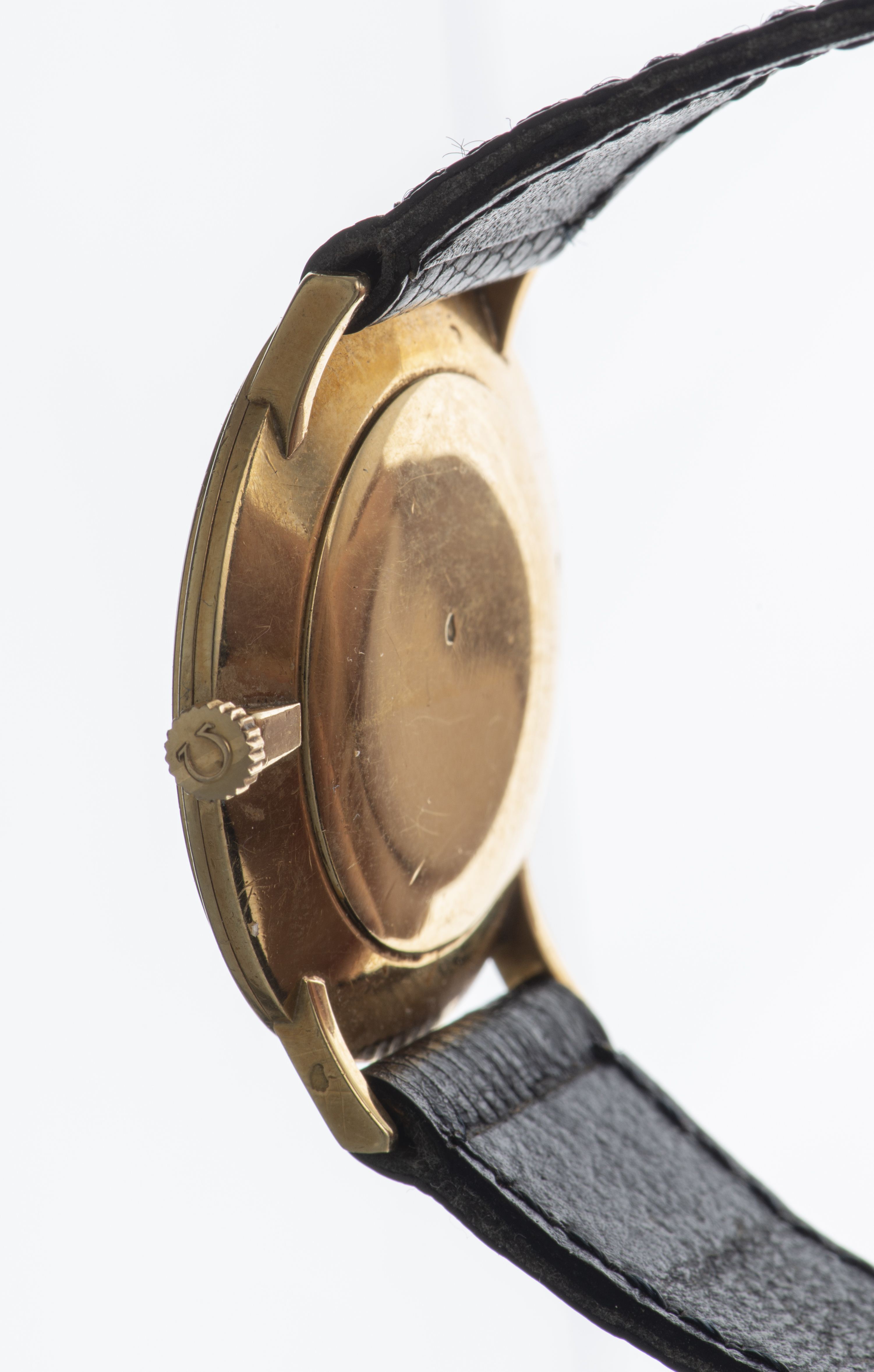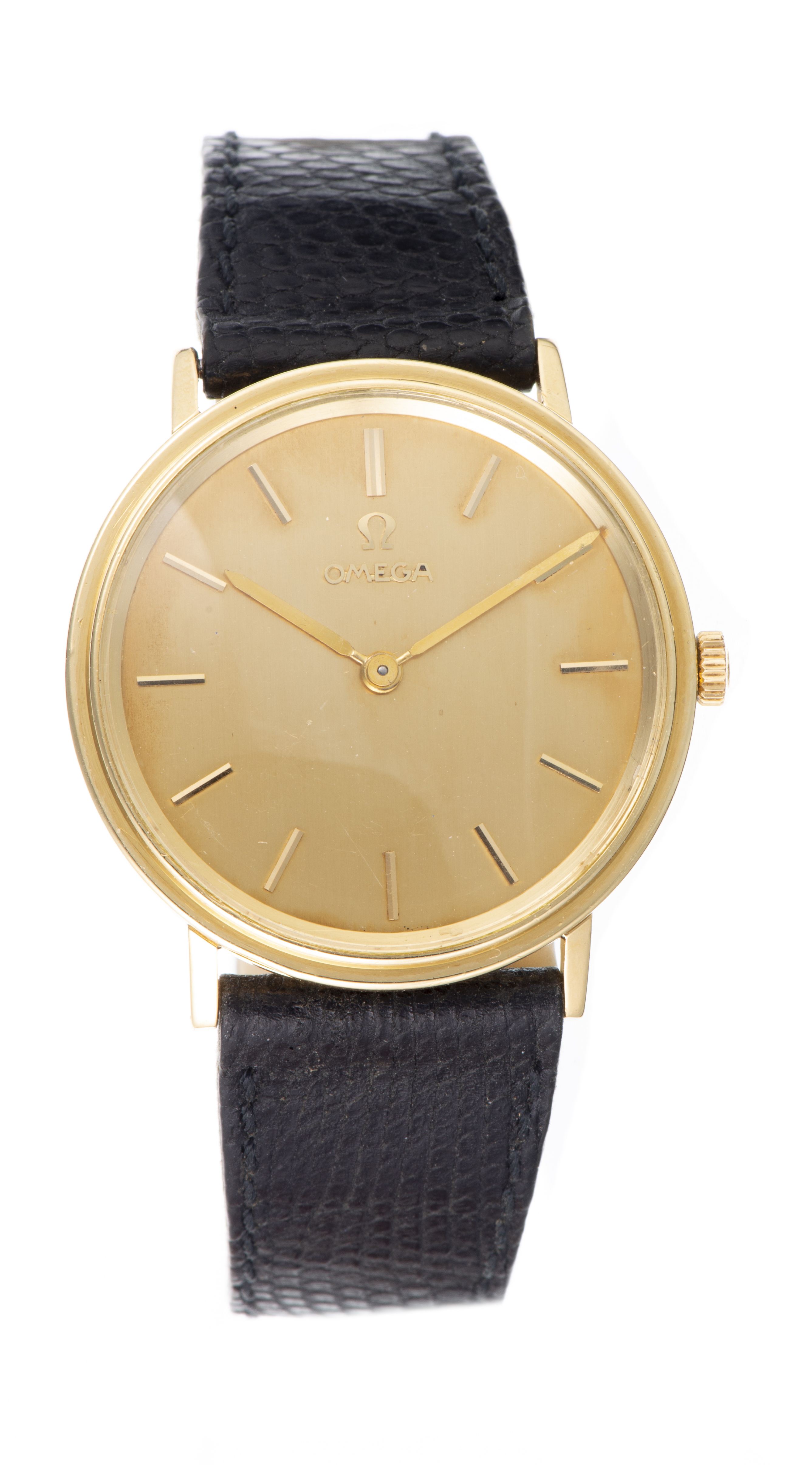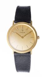 OMEGA, Montre-bracelet, boîtier rond en or jaune .750, index & cadran en or jaune, bracelet en cuir noir, mouvement mécanique.