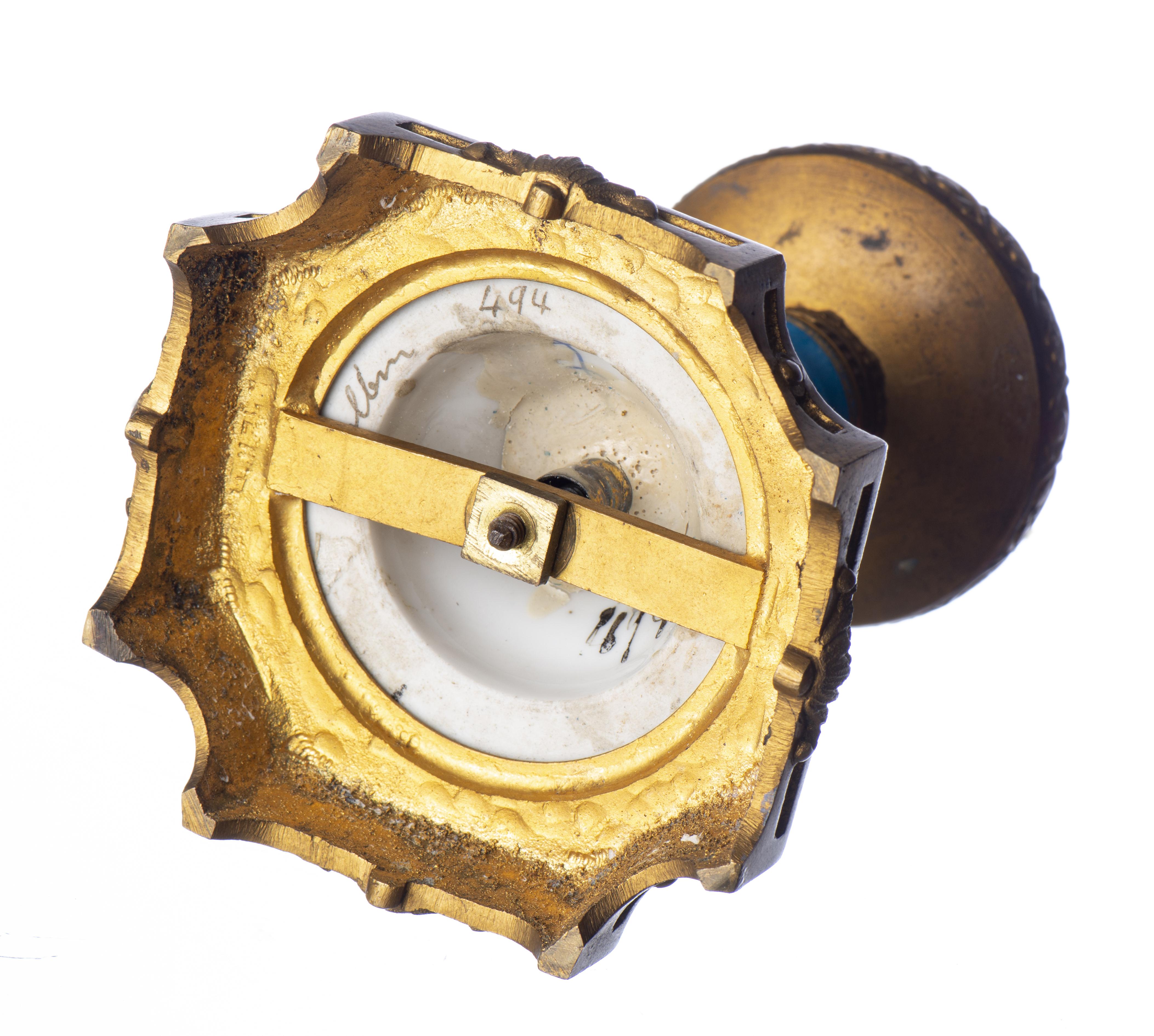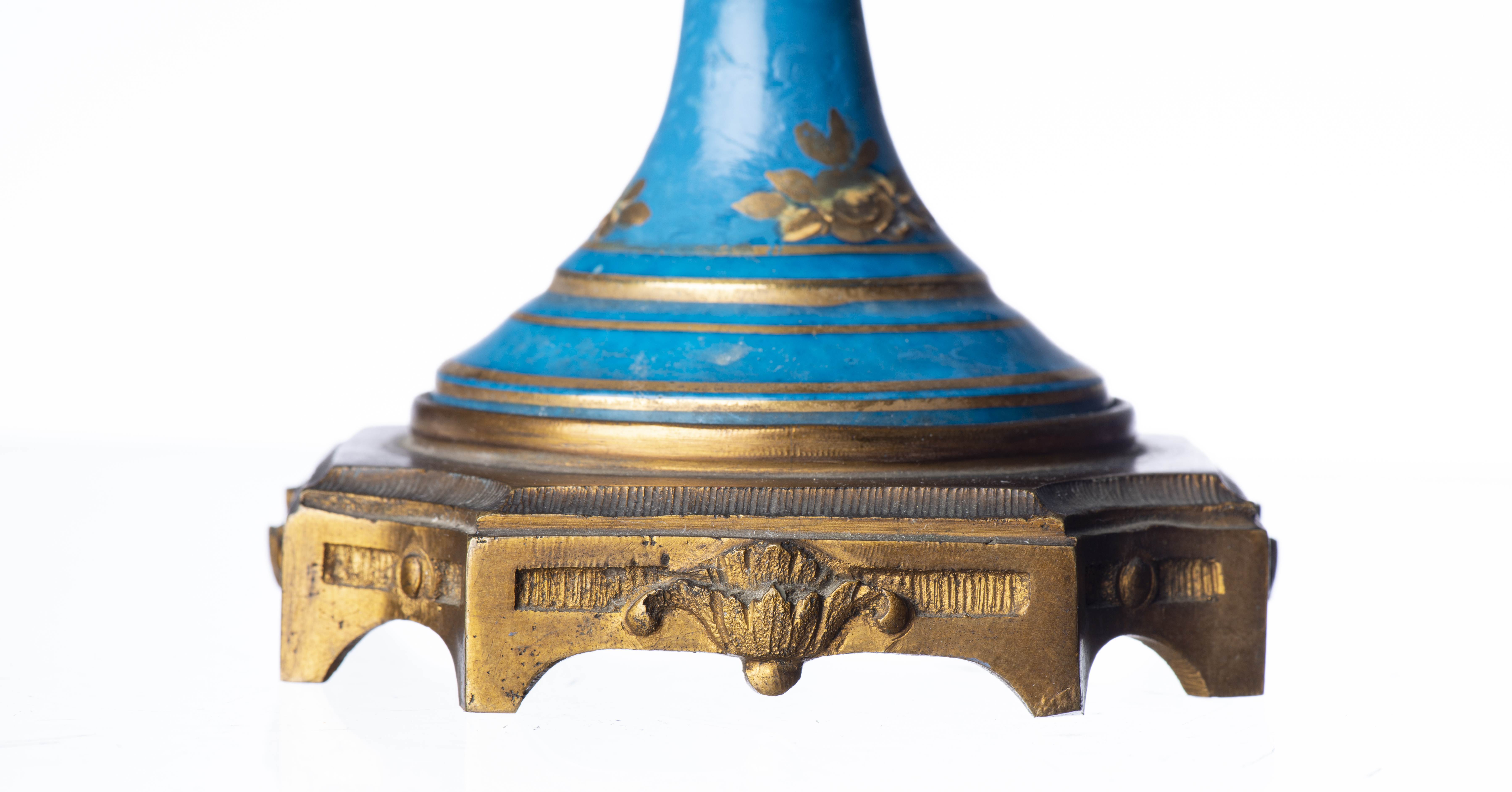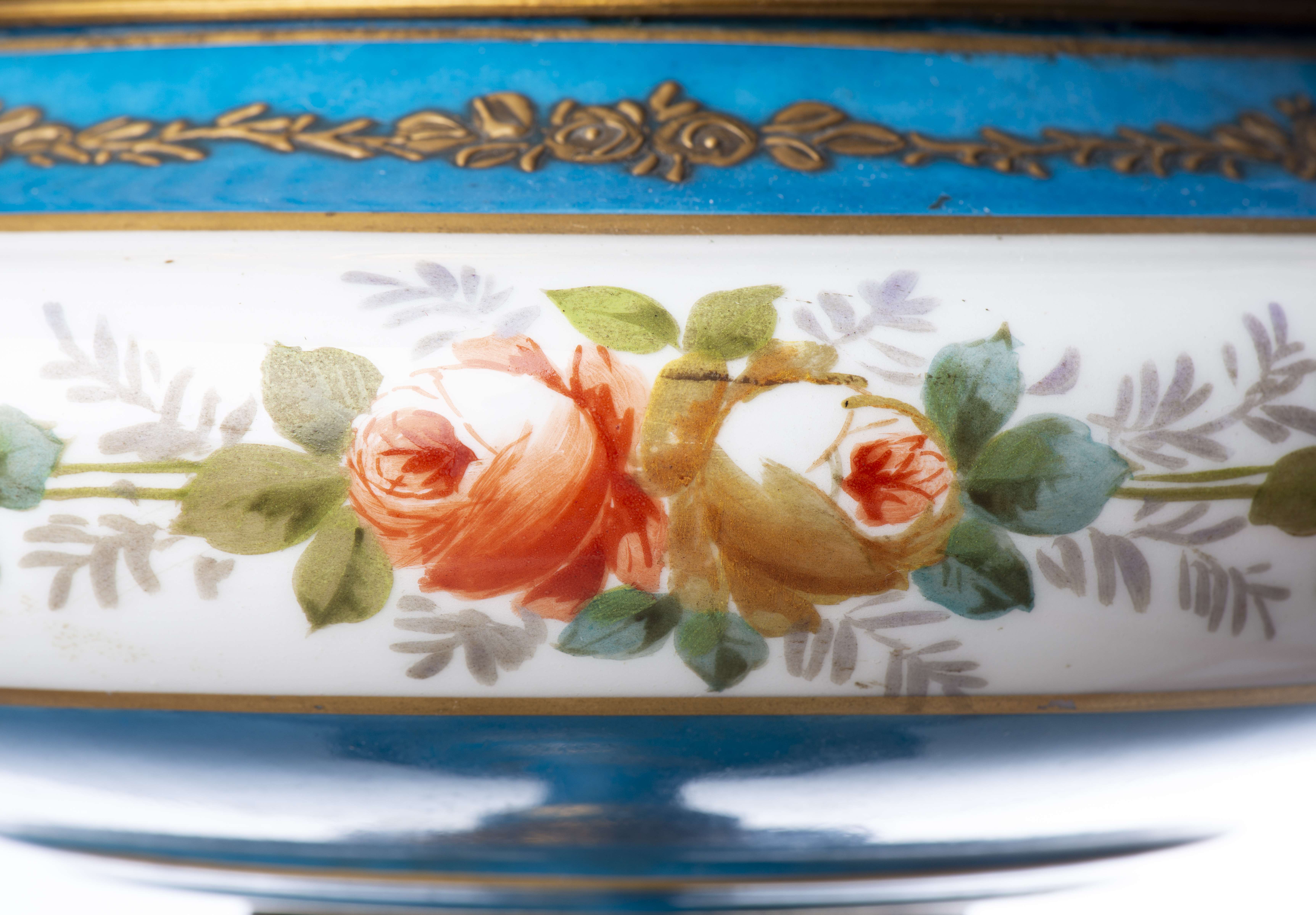 SEVRES, décoration de table sur piédouche central en porcelaine à décor floral sur champ bleu, monture en bronze doré d'époque Nap. III