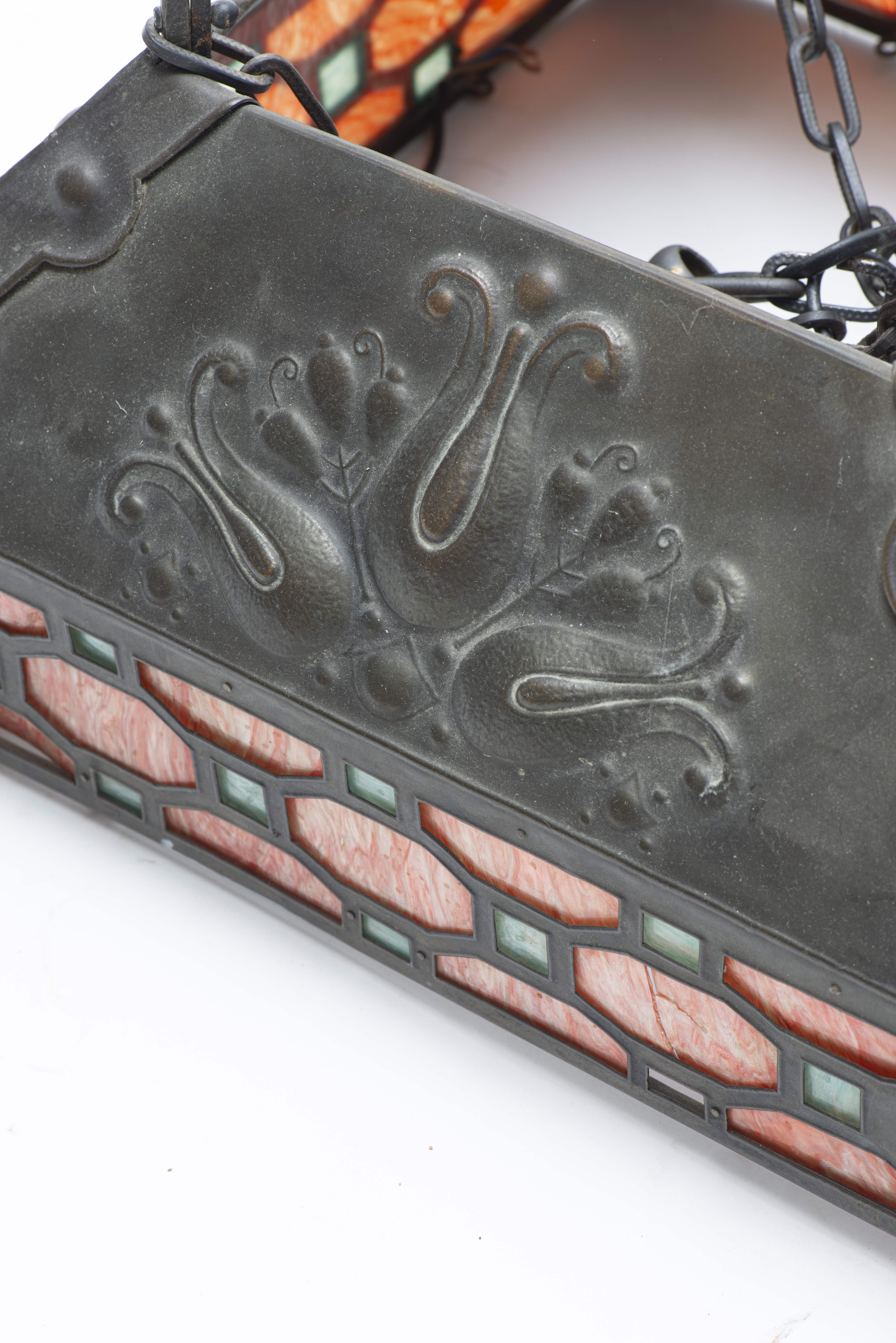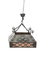 Travail Art nouveau, Suspension à un feu de forme carrée à structure en laiton et métal à décor de feuilles. Agrémenté de vitrail orange, jaune et vert en pourtour.