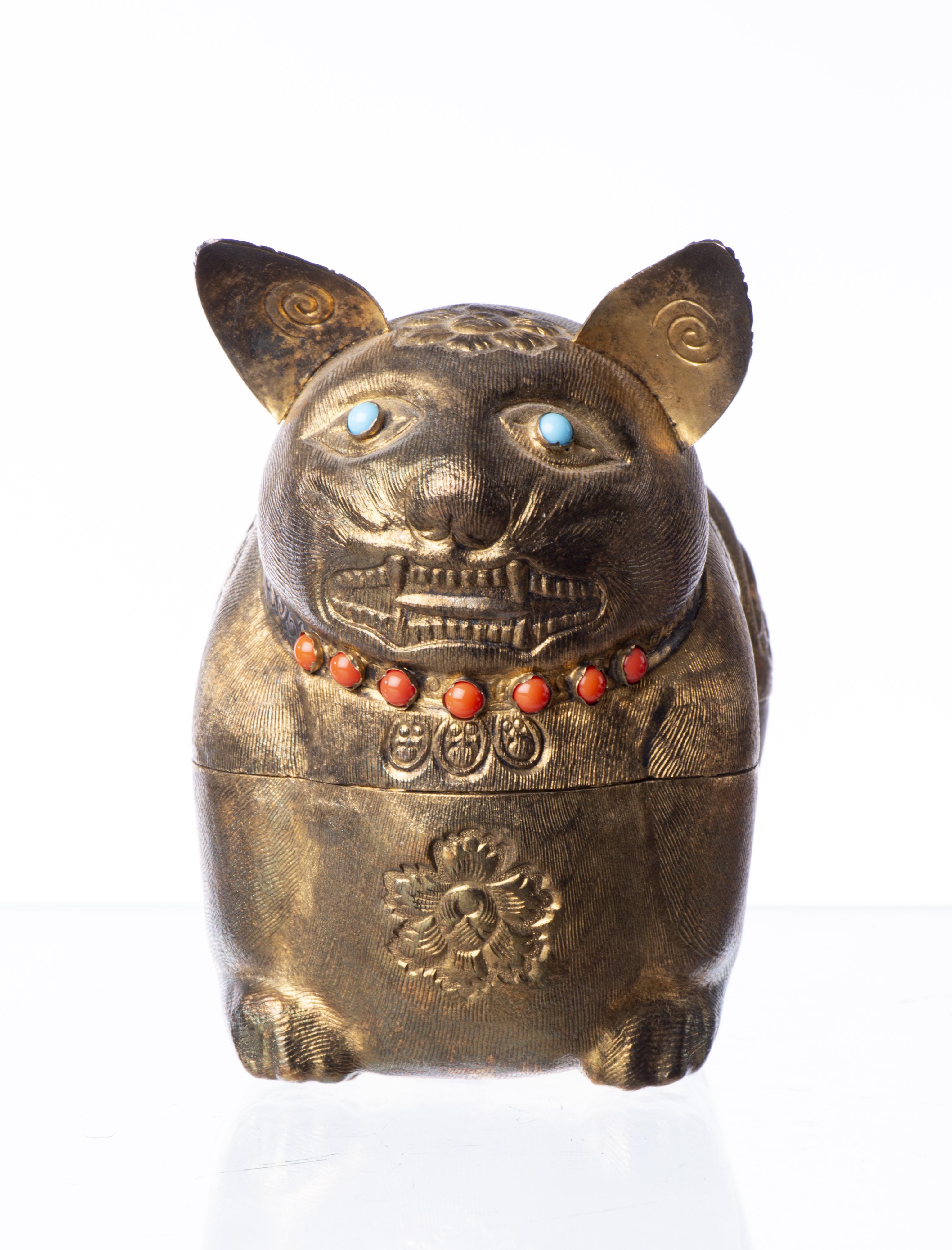 SAKS Fifth Avenue Italy, boîte en métal doré repoussé en forme de chat façon Indonésie avec billes imitant la turquoise et le corail.