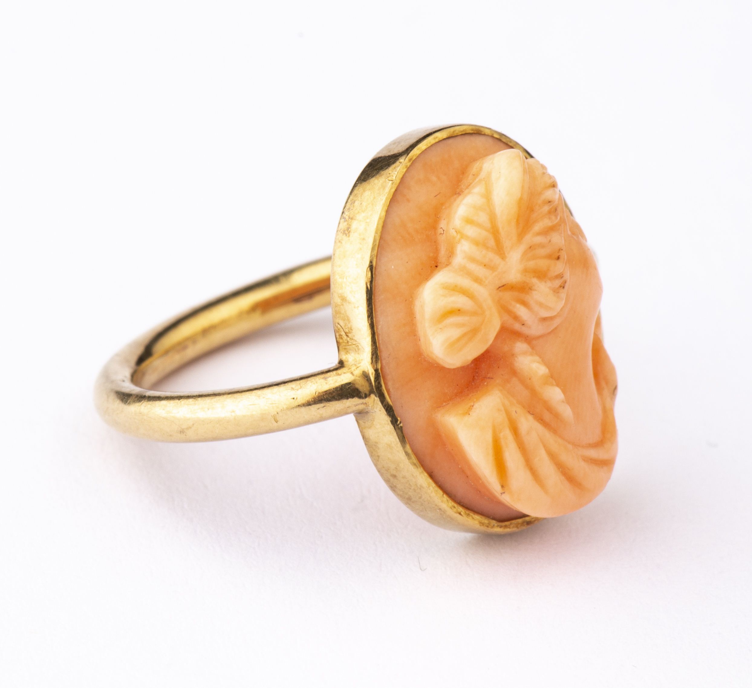 Bague en or jaune .750 avec une table en corail rose sculptée d'un profil façon camée ovale.