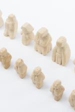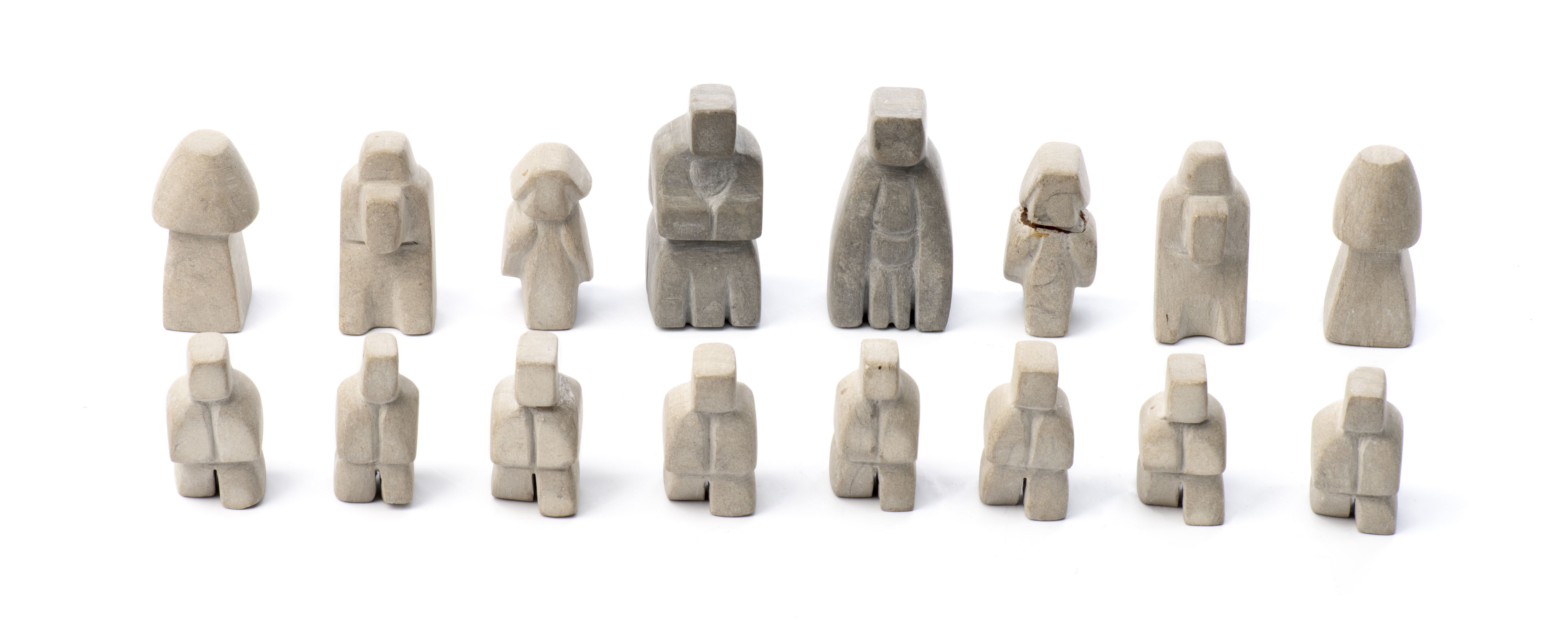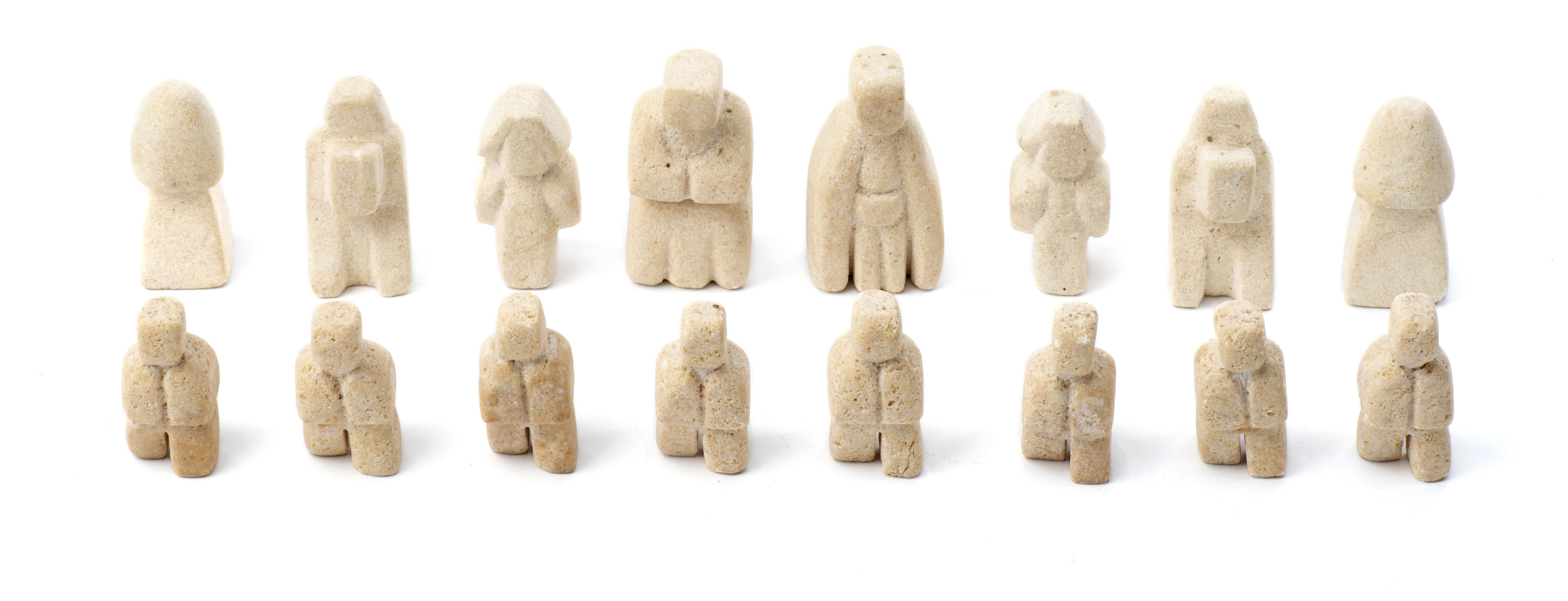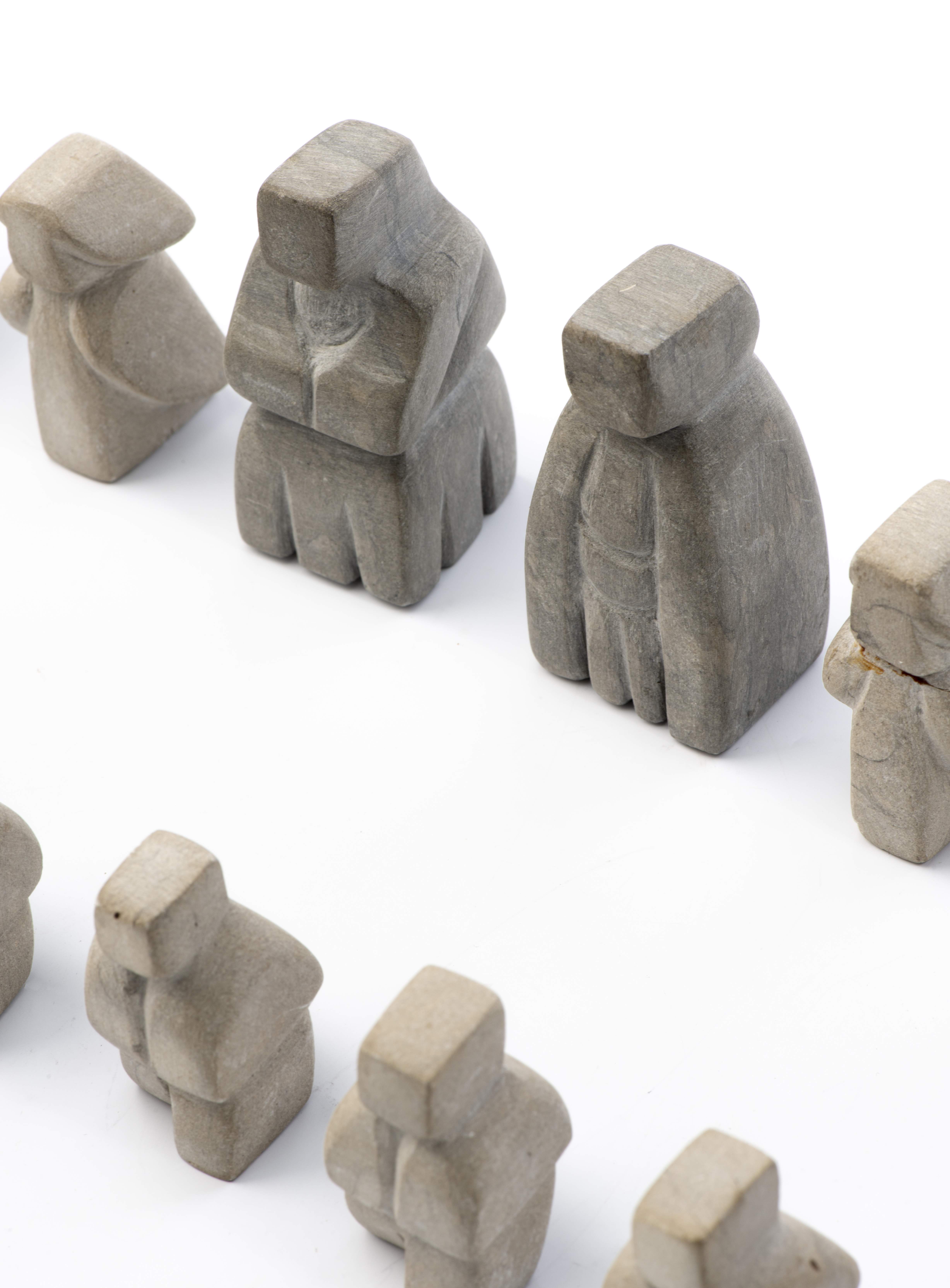 Dominique Lonchampt (née en 1952), jeux d'échec en pierre taillé à la main, pièce unique, travail d'artiste, chaque figure est signé