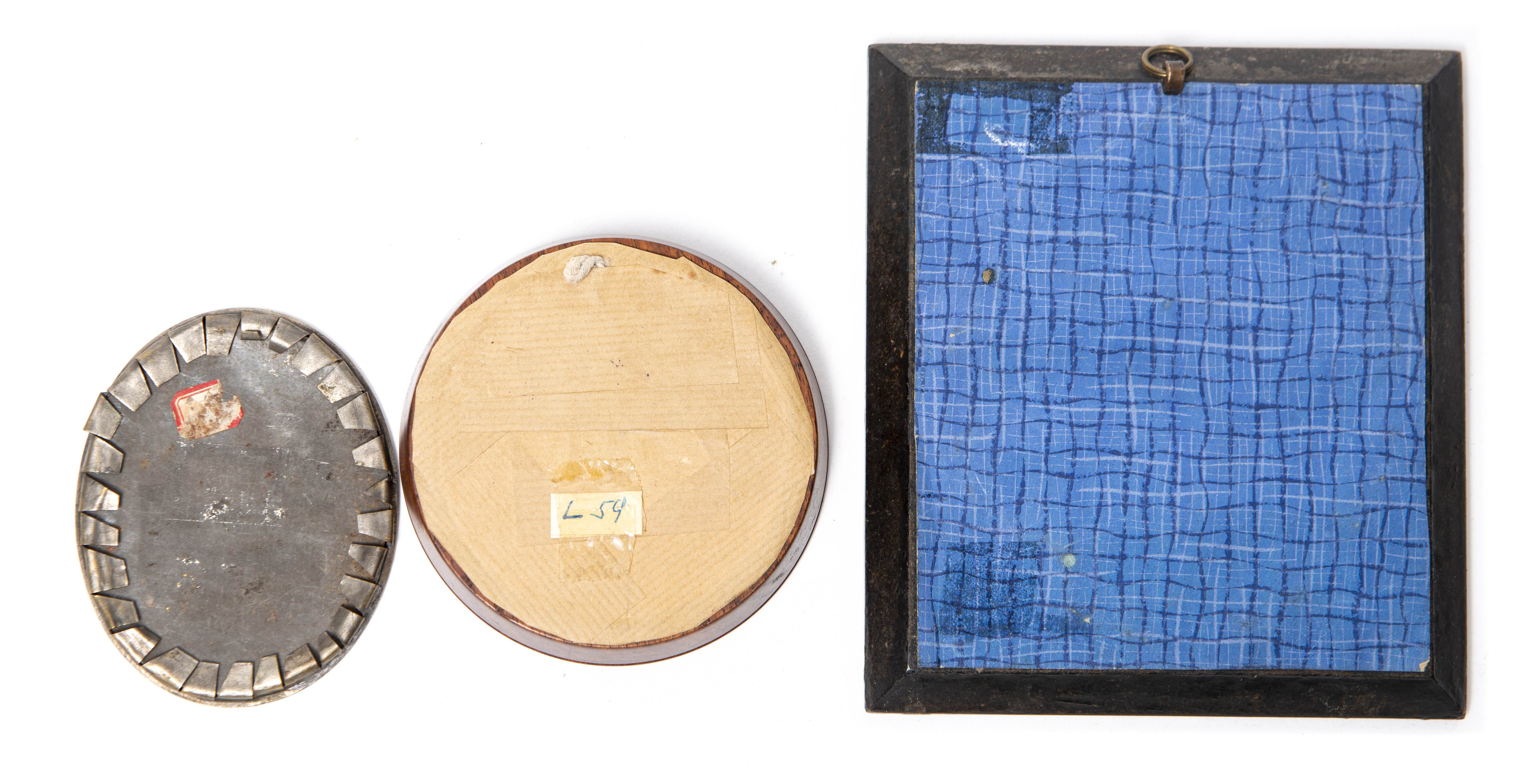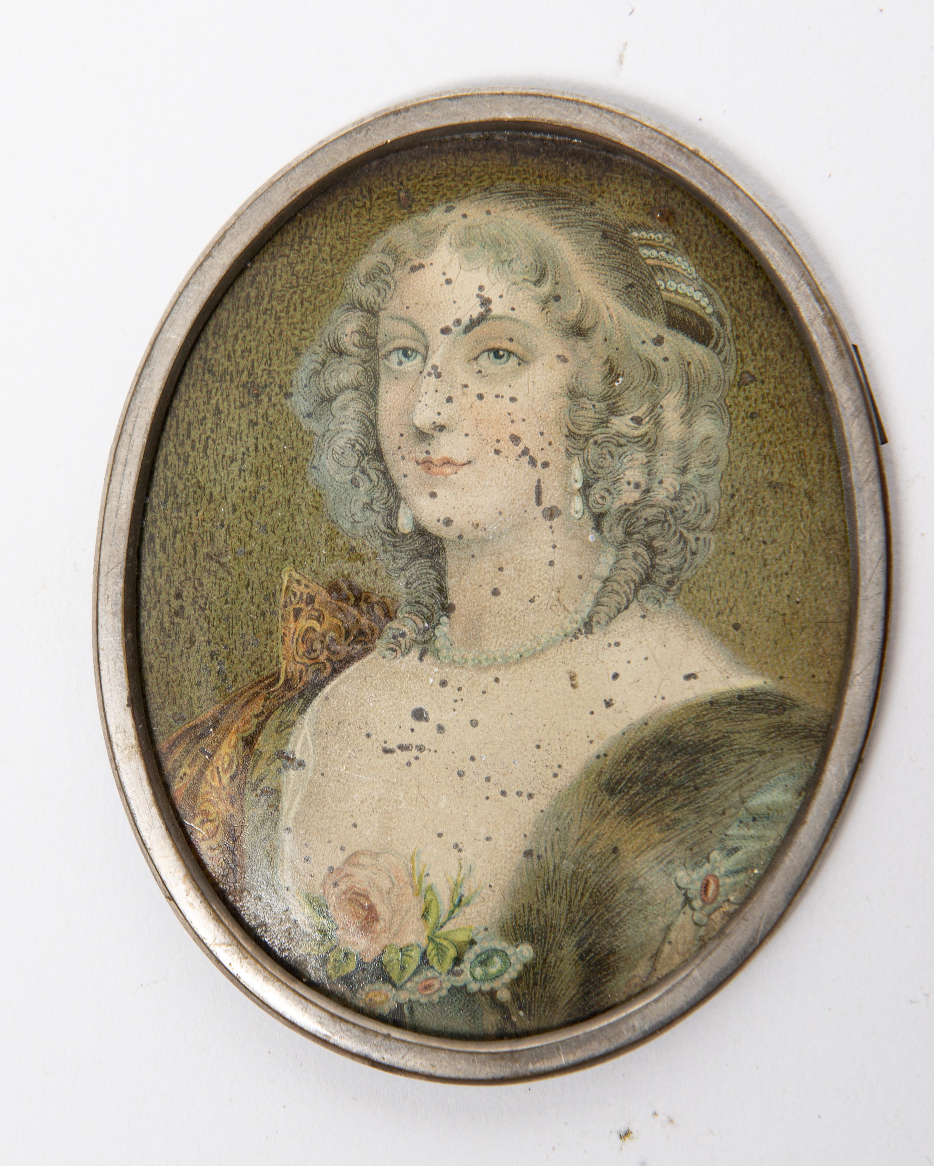 - une miniature ovale. Gouache sur papier représentant une femme coiffée à la manière du début de l'époque victorienne, boucles tombant de chaque côté du visage et chignon sur le dessus de la tête, portant une robe bleu découvrant les épaules à manches bouffantes et une miniature suspendue à son cou par un ruban de dentelles blanches. Signature verticale illisible sur le côté gauche. XIXe.