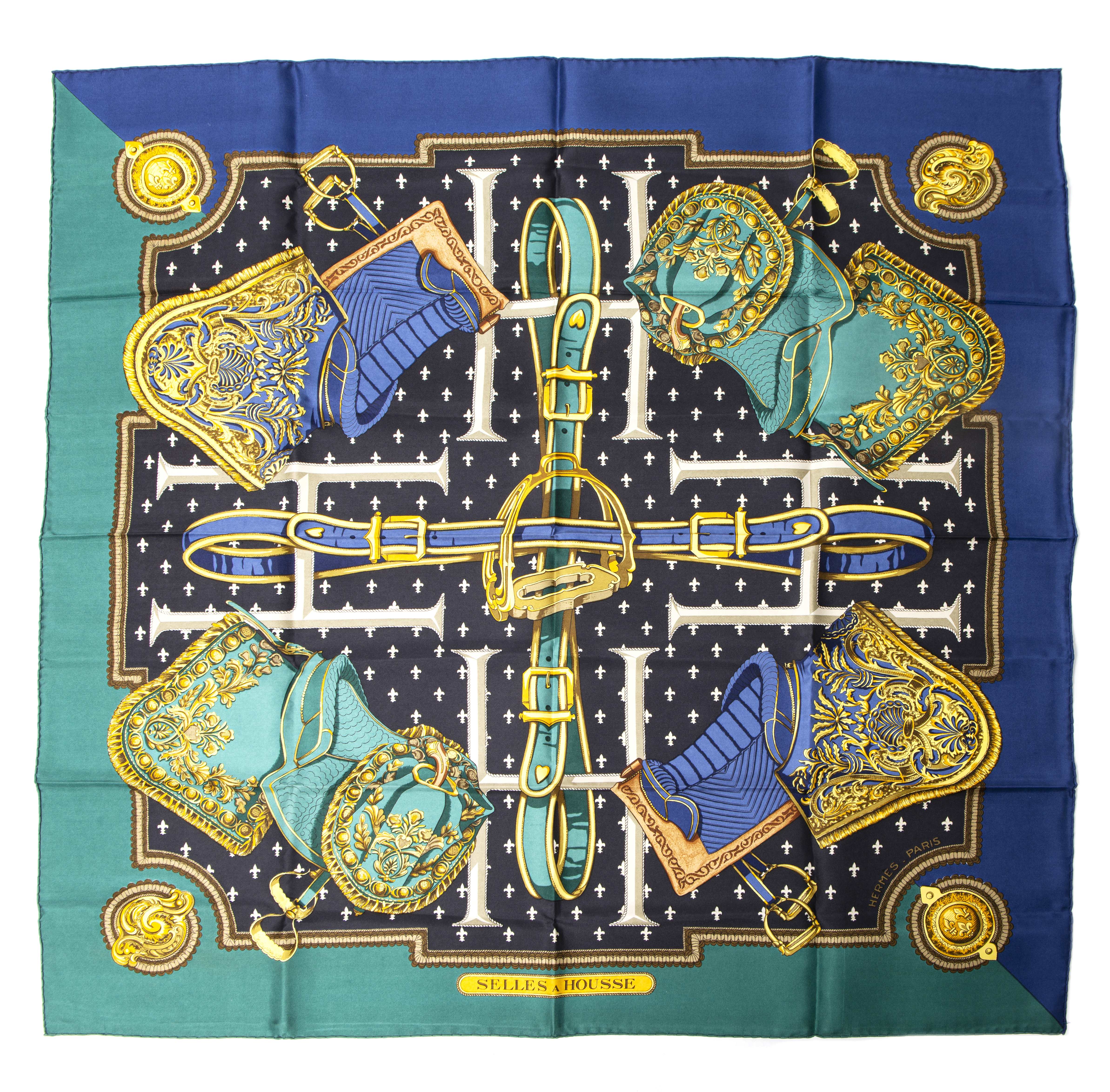 - HERMÈS, carré en twill de soie roulotté à la main "Selles à Housse", à pourtour ou bordure marine et vert en soie. Couleurs: Blanc Bleu Marine Vert. Création Christiane Vauzelles; Année de sortie: 1968, dans sa boîte.