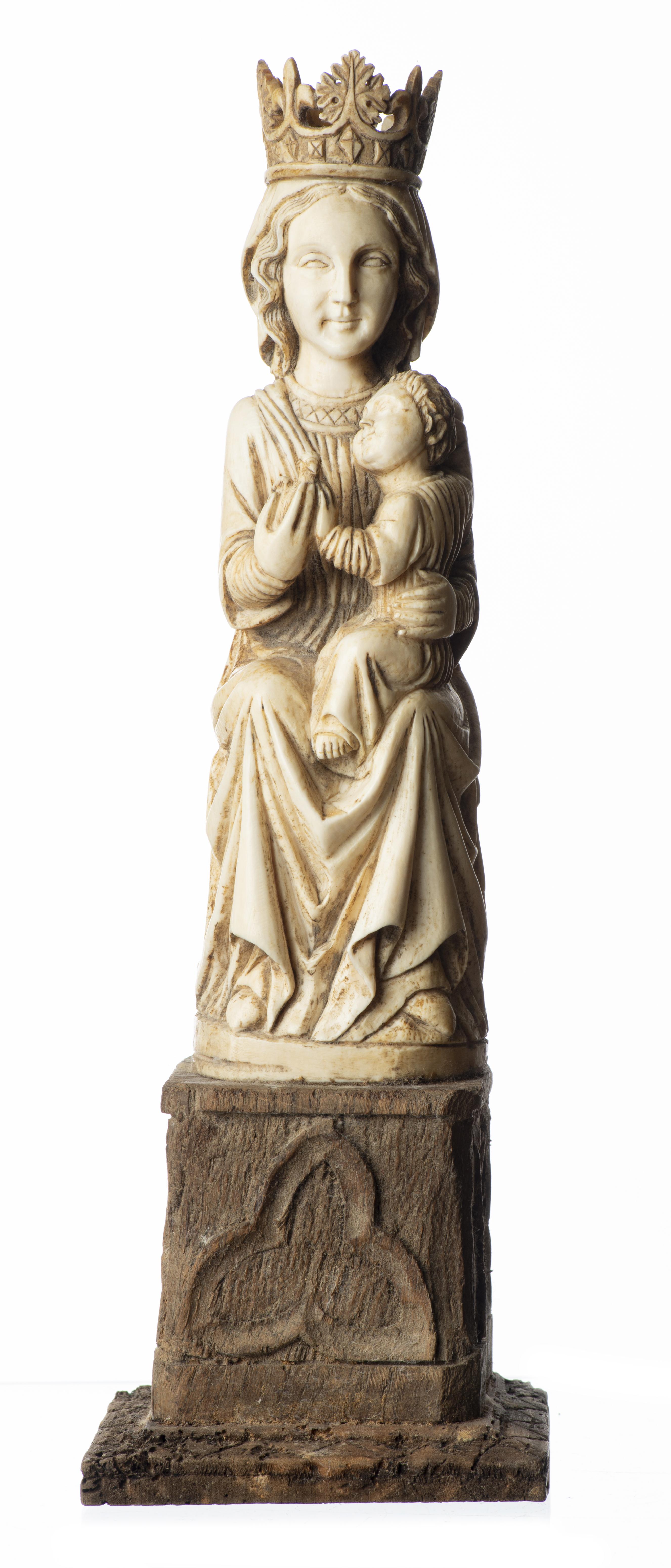 Maternité assise avec le Christ sur son genou gauche et tenant de sa main droite la colombe.