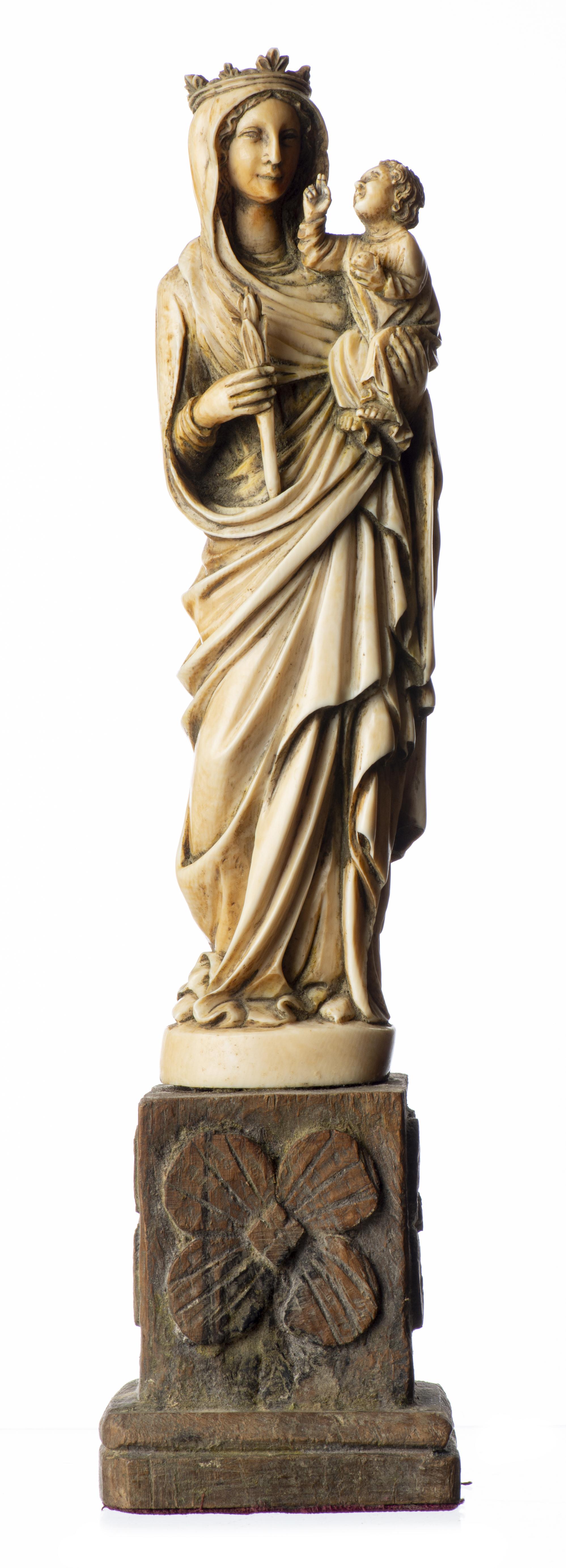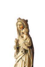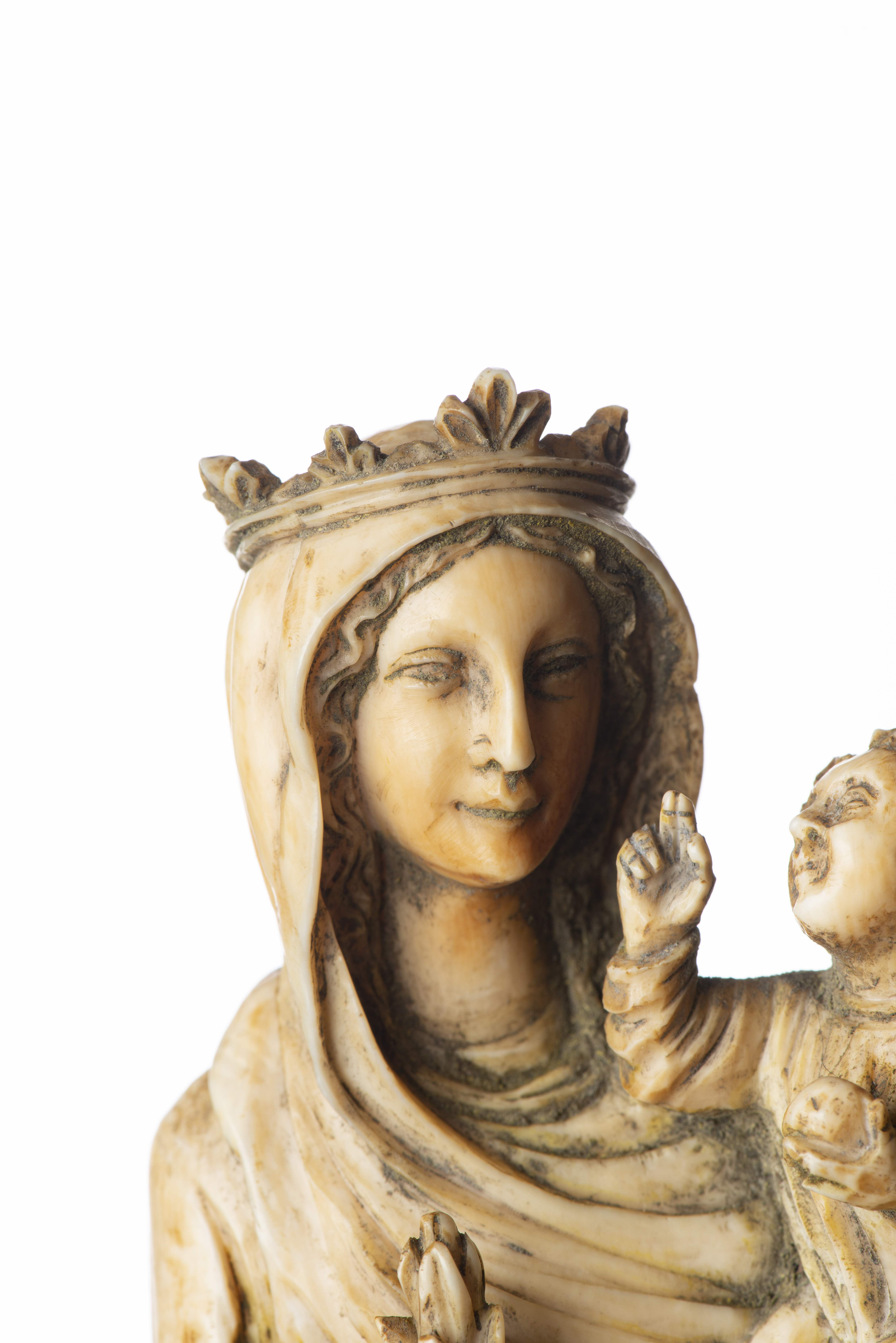 Maternité debout tenant dans sa main droite une tige avec bouton et le Christ de son bras gauche.
