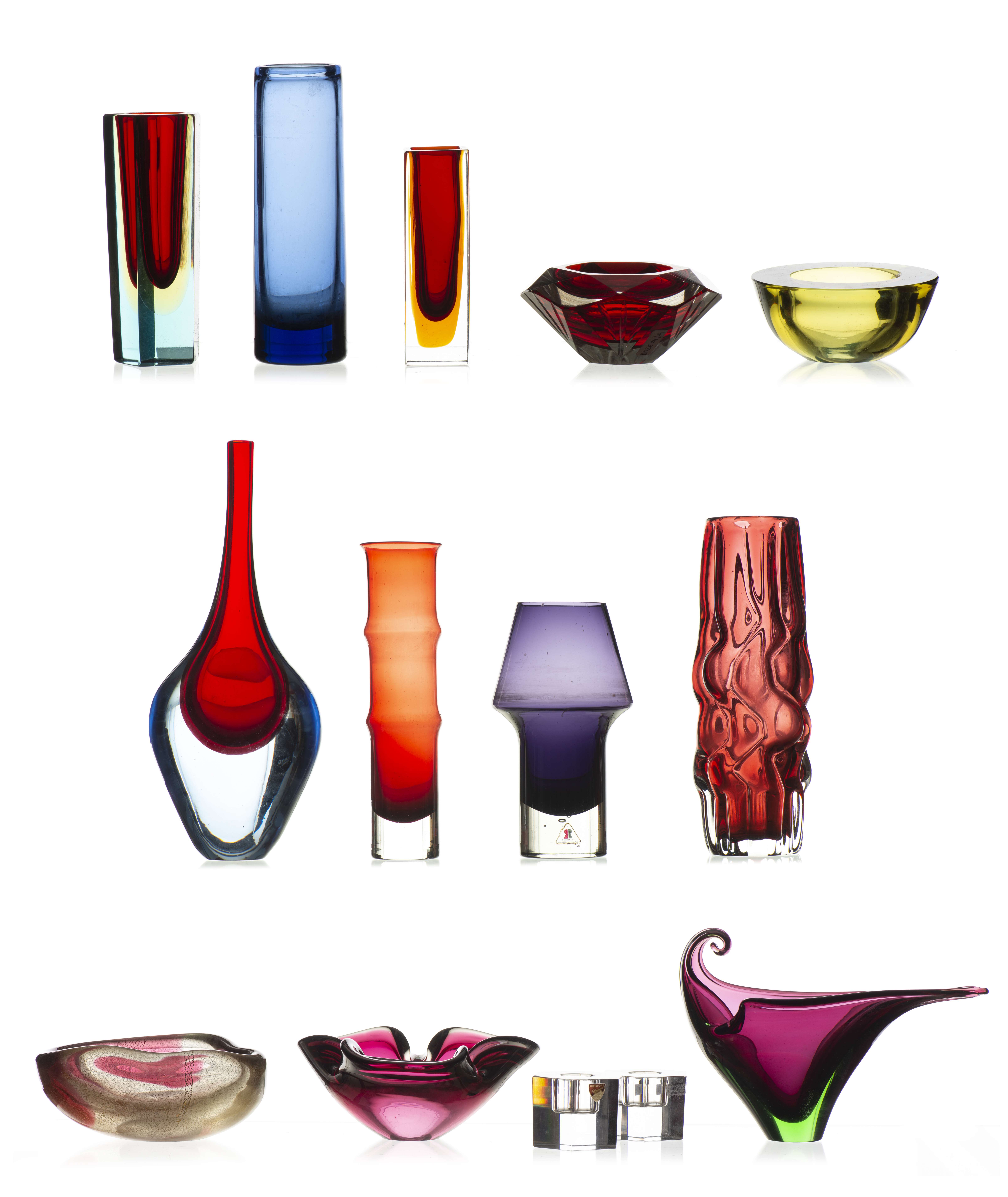 MURANO, RIIHIMAKI & ORREFORS, Belle collection de 14 pièces en verre