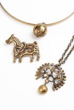 Ensemble de bijoux finlandais comprenant un tour de cou avec pendentif boule, un collier à pendentif et une broche représentant une chèvre stylisée.