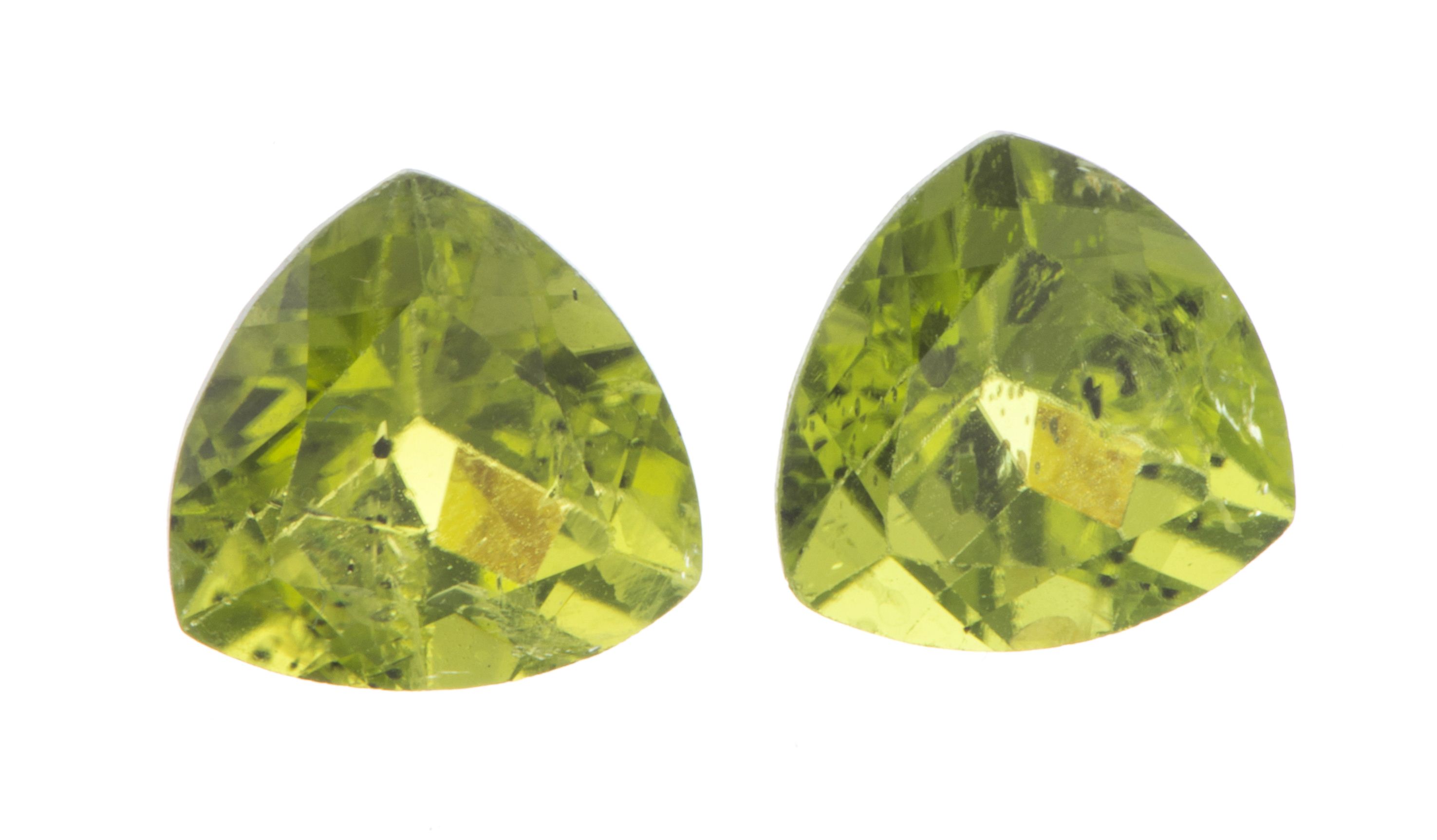 Paire de péridots de taille trillion pour un total de 12.84 cts.