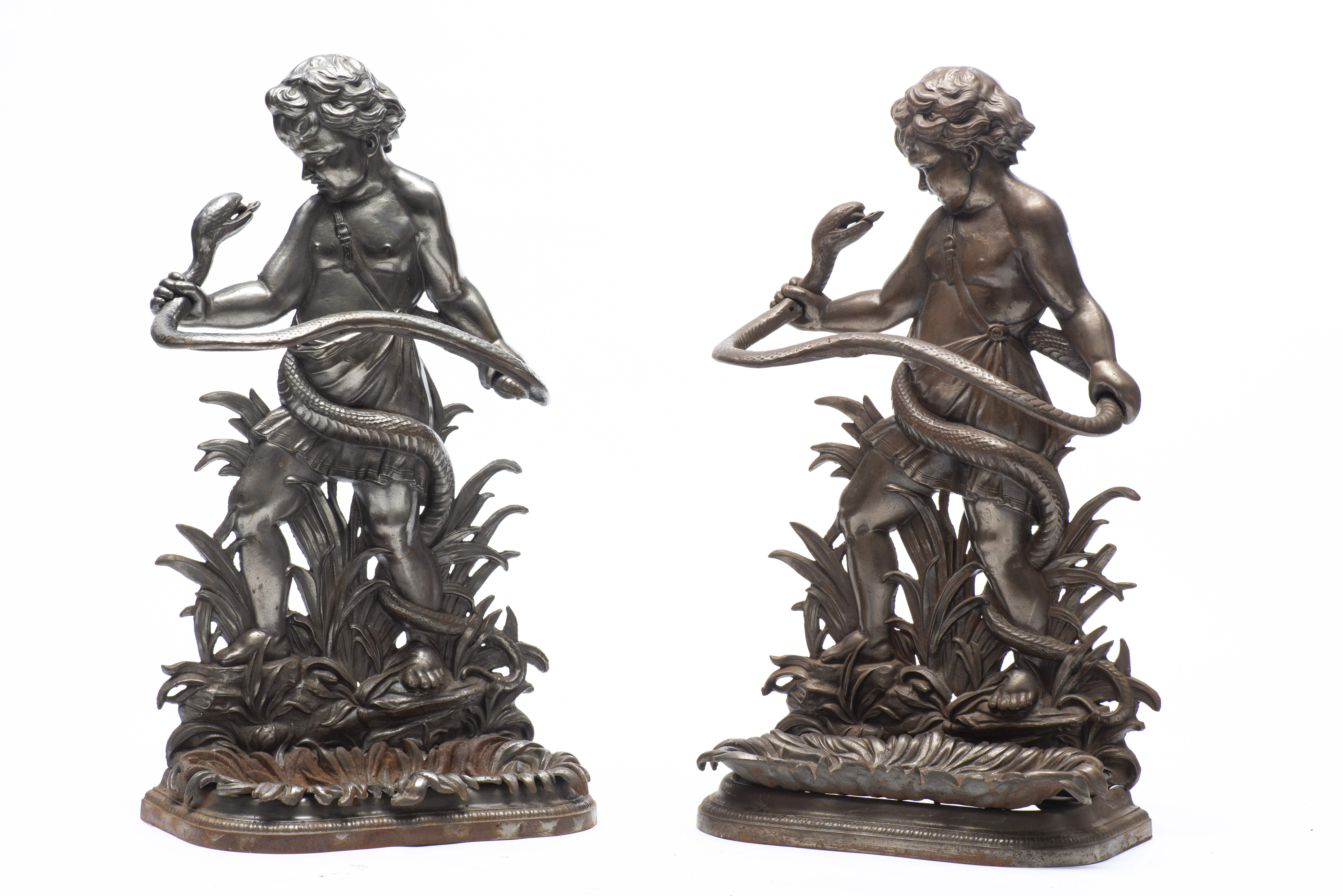 Edwin Smith (1810-1889) et Theophilus Smith de Sheffield, deux porte-parapluies en fonte représentant Héraclès petit combattant un serpent XIXe circa 1860.