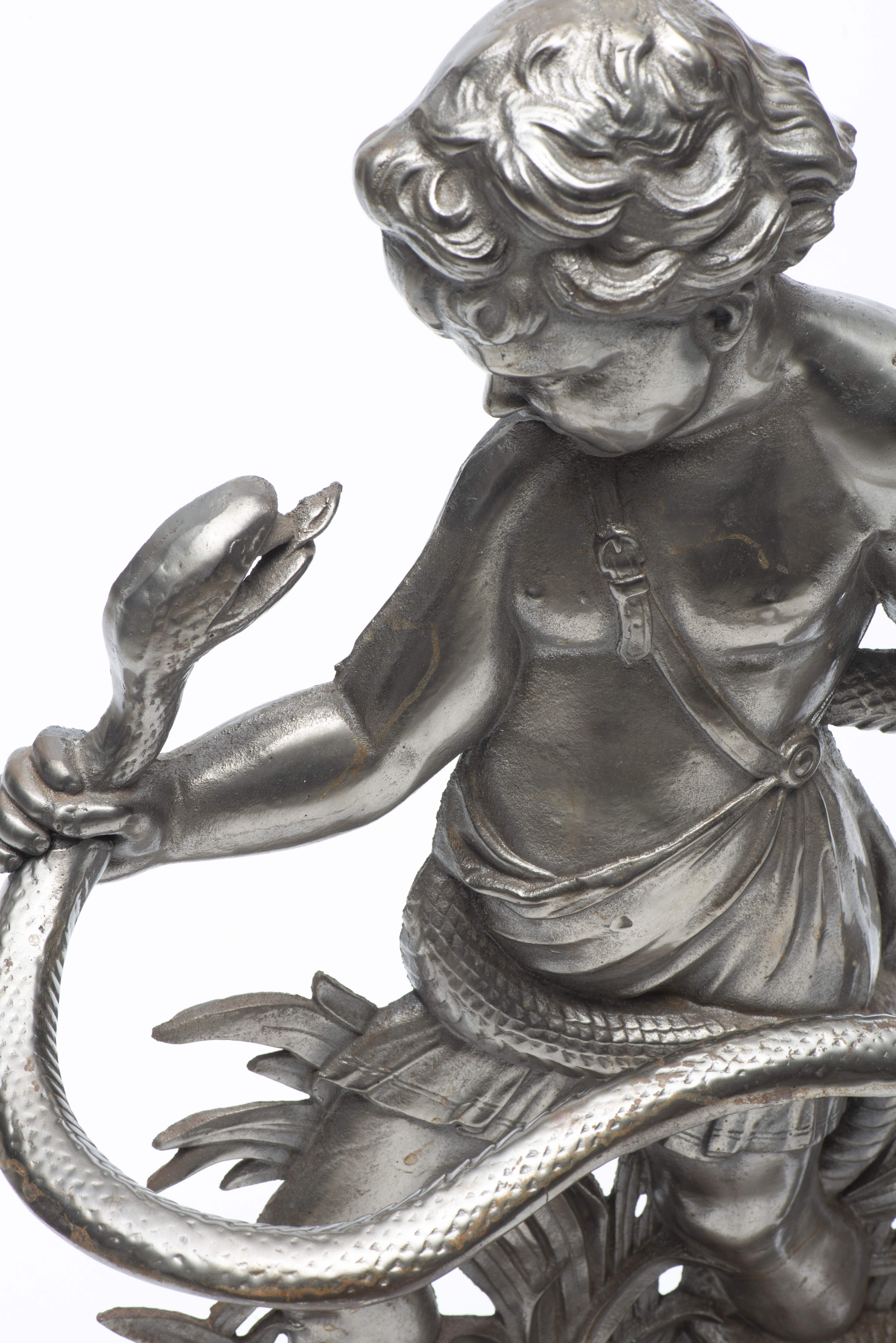 L'enfant Hercule est représenté luttant contre un serpent, qui est enroulé autour de lui et forme la rambarde pour les cannes ou les parapluies.