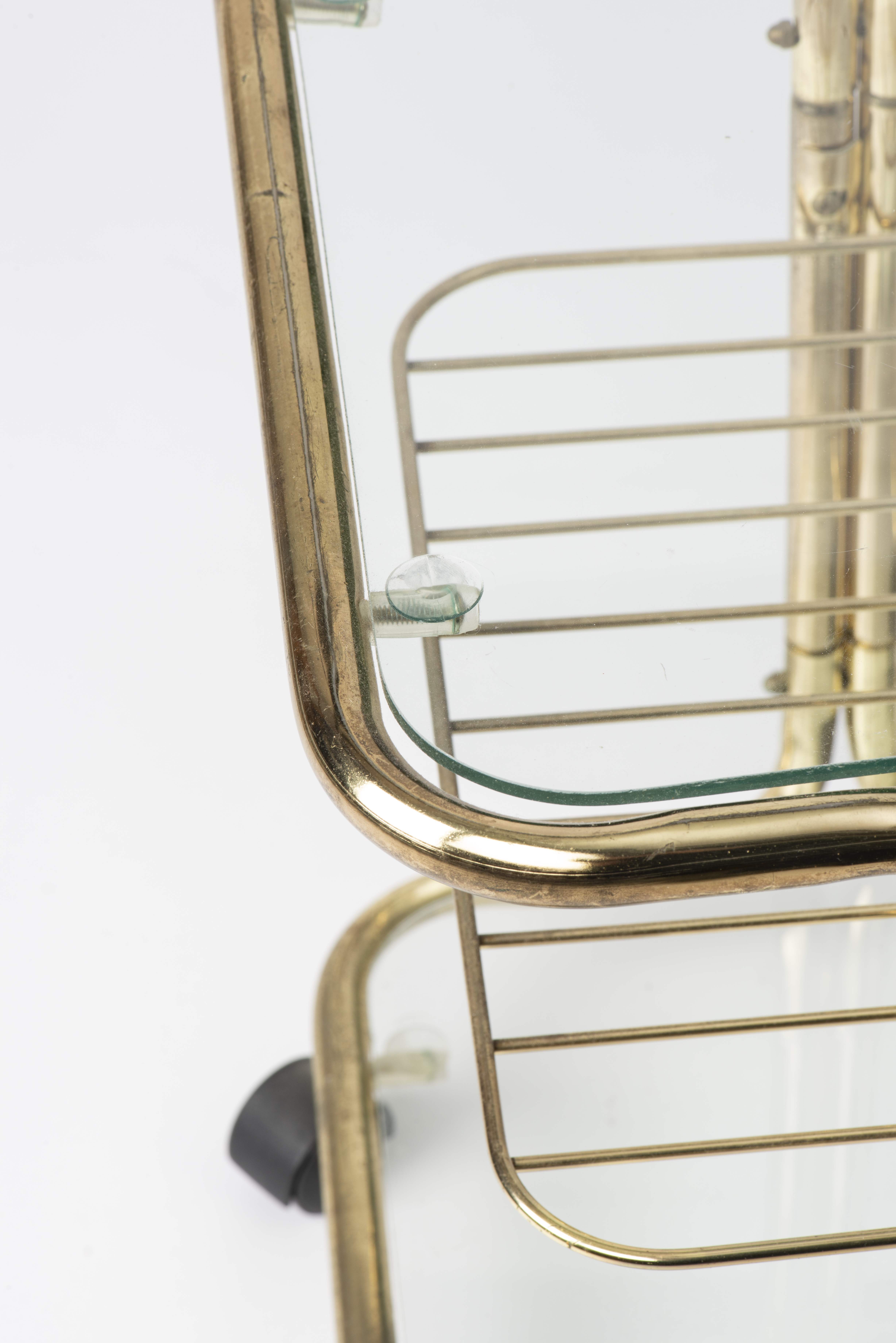 Ingmar RELLING (1920-2002) dans le goût de, petit servir-boy en métal thermolaqué doré sur roulettes, avec tablette inférieure et plateau en verre, grille intermédiaire en métal doré.