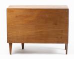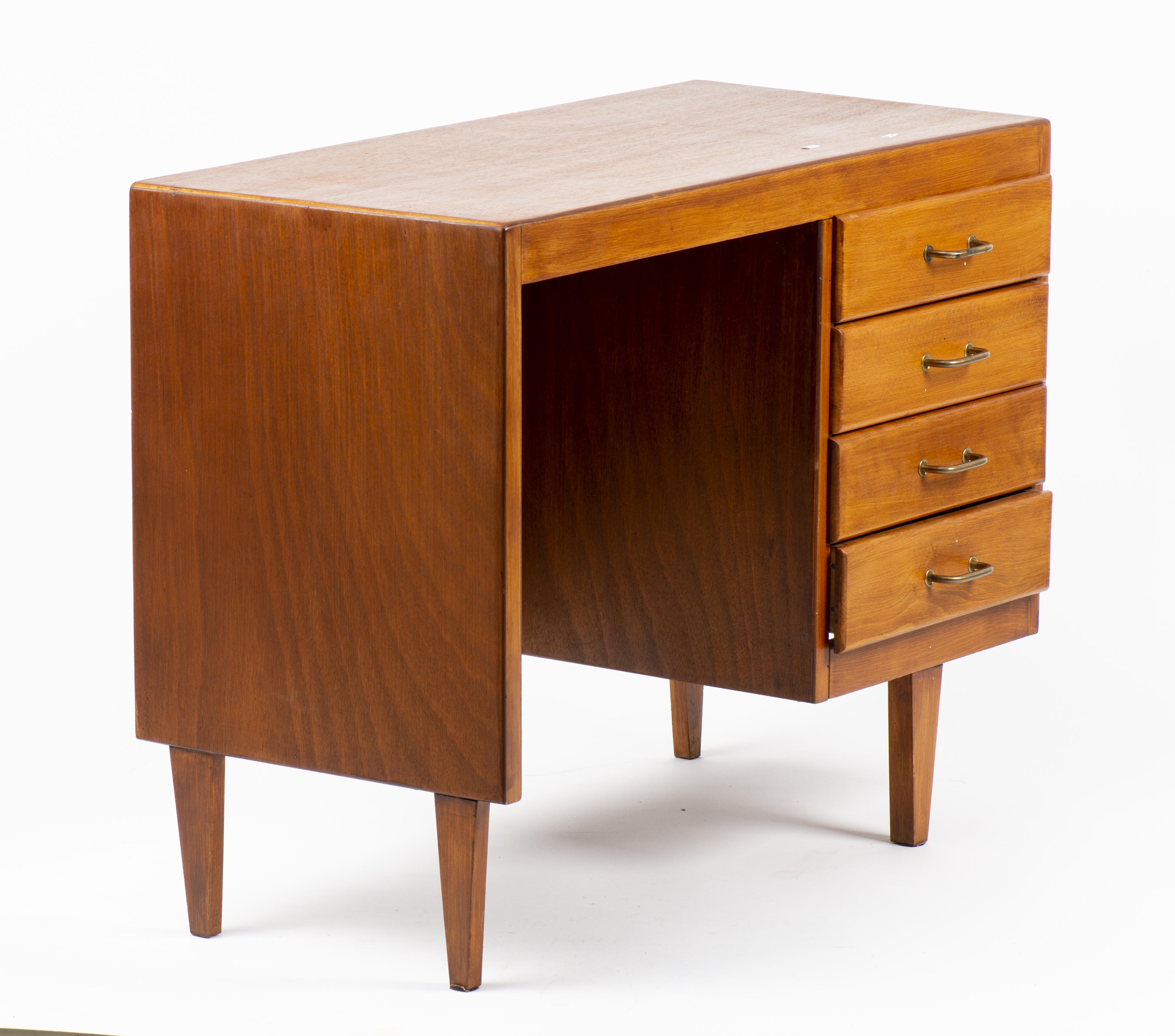Travail Scandinave, petit bureau en bois massif, caisson ouvrant par quatre tiroirs à poignée en bronze doré.