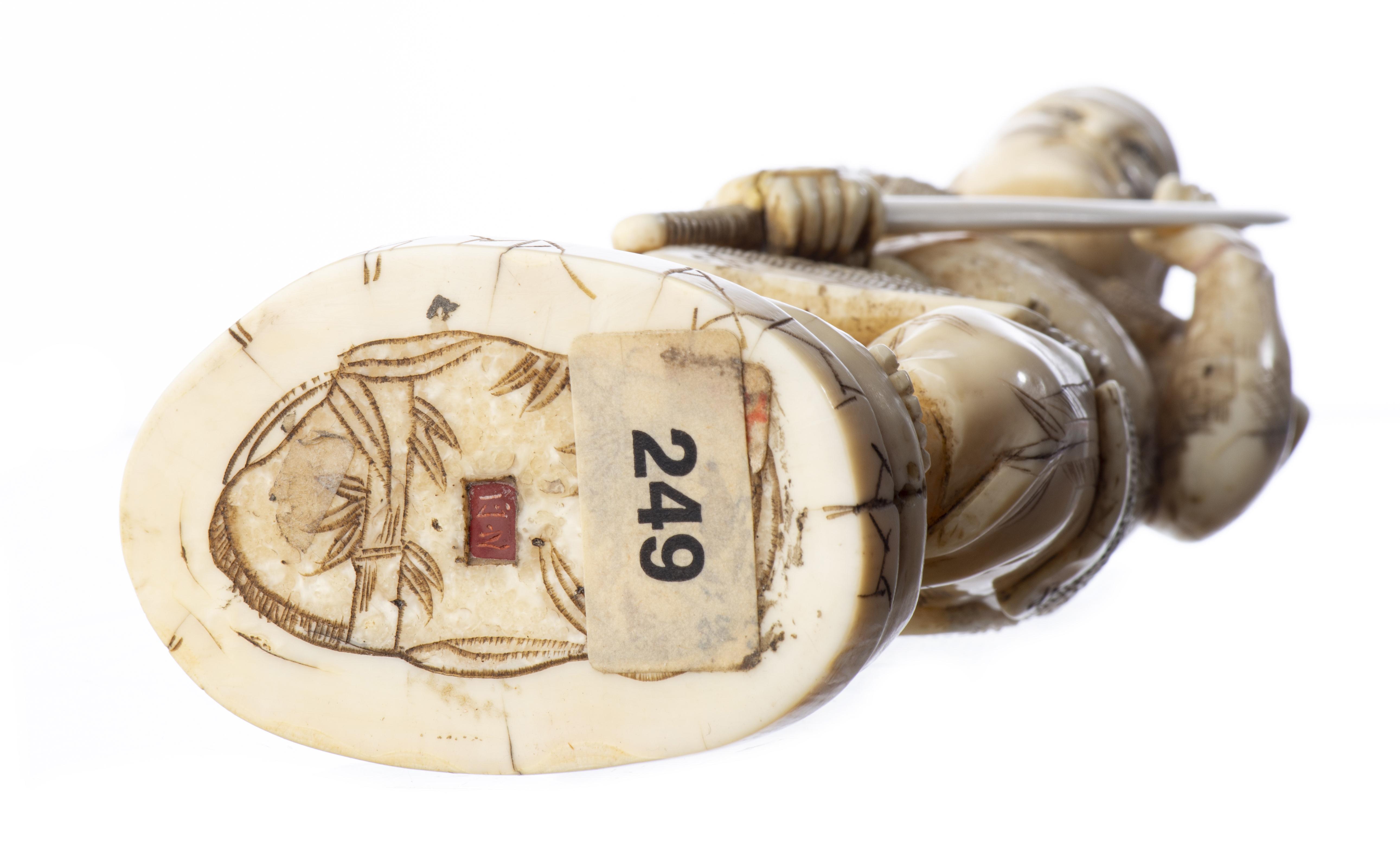 JAPON, Okimono en ivoire du Japon représentant un samouraï tenant la lame de son sabre, lame hors de son fourreau, ère Meiji, signé dans un cachet rouge 心之