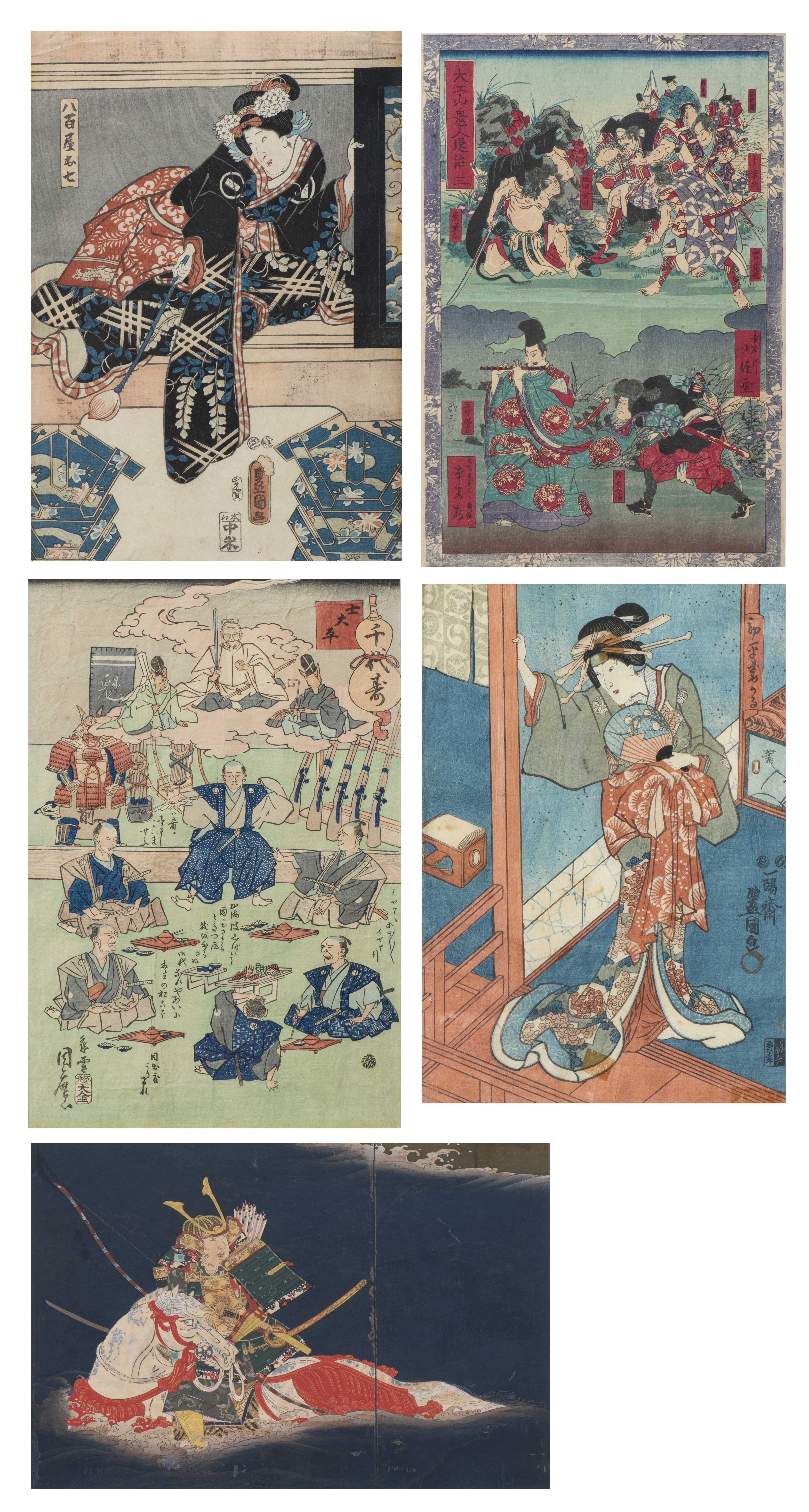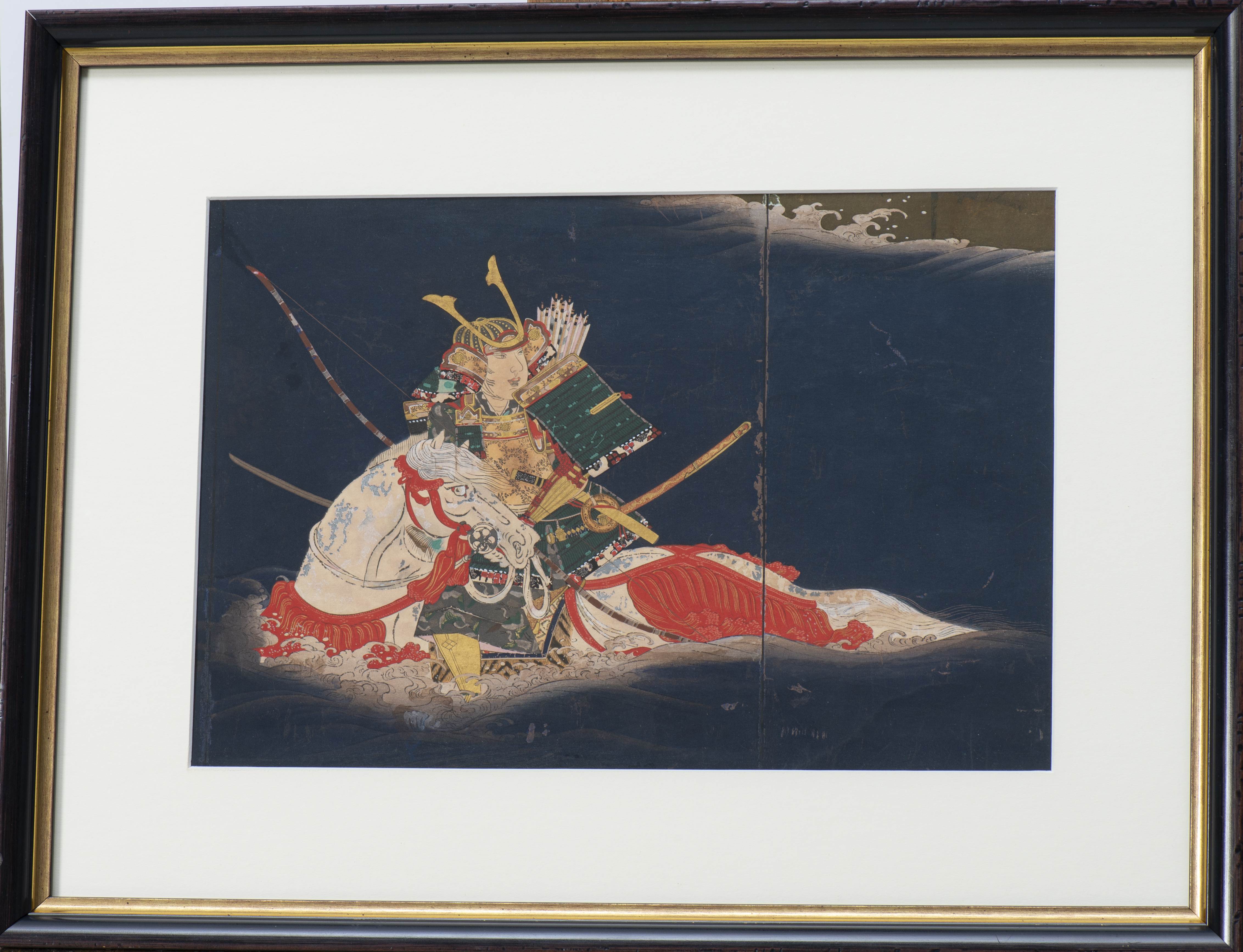 On y joint une très bonne reproduction rehaussée à la gouache d'une peinture de paravent représentant un samourai à cheval traversant une rivière.