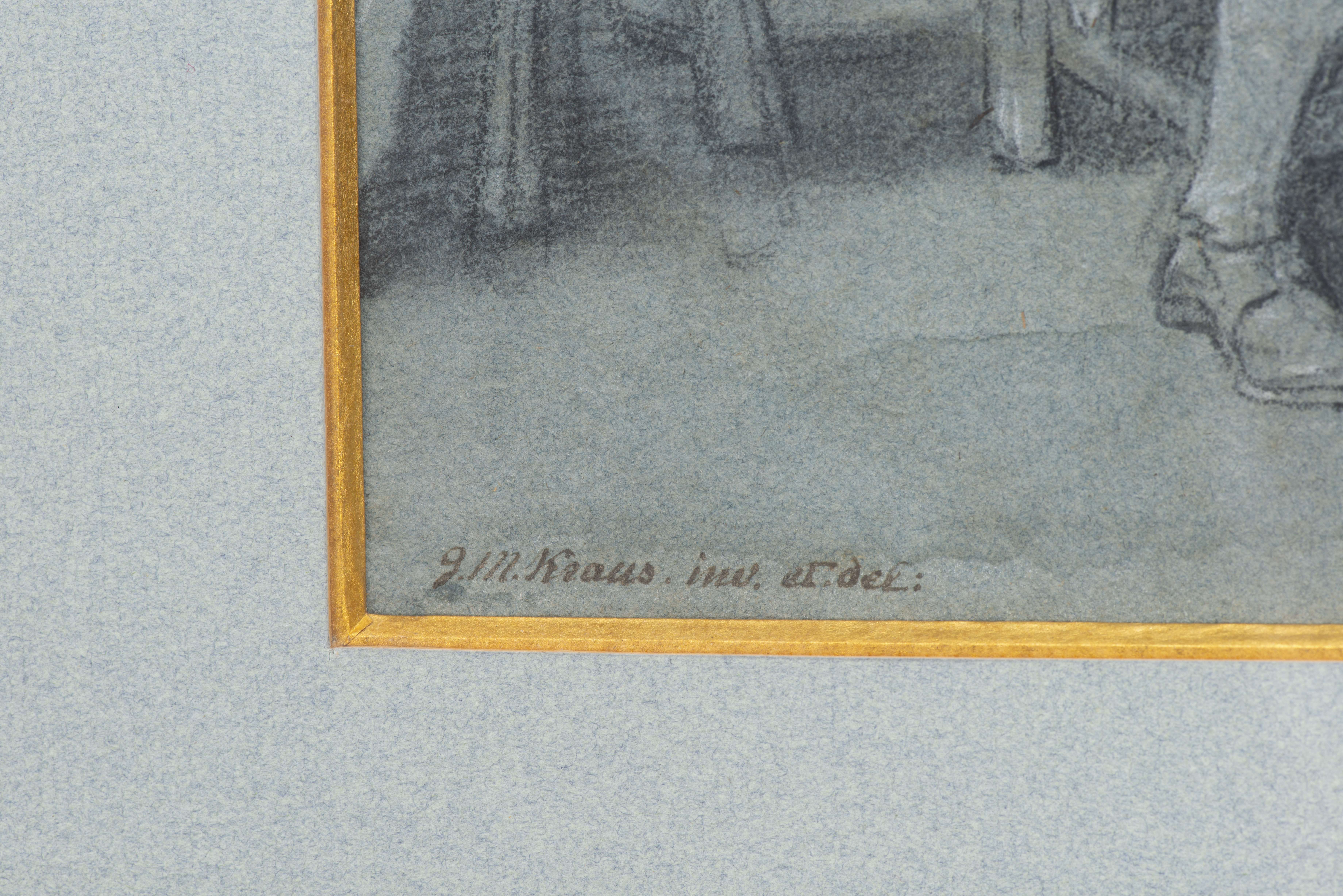 Georg Melchior KRAUS (1737-1806), 'Scènes de taverne', deux fusains sur papier bleu rehaussé à la craie blanche, signé en bas à gauche et en bas à droite à l'encre.