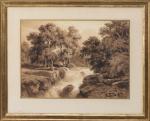 Alexandre CALAME (1810-1864), 'Paysage au cours d'eau', Lavis sépia et encre sur papier