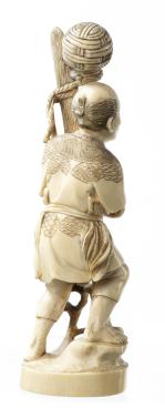 JAPON, Okimono représentant un pêcheur tenant sa rame et un panier vide. Ère Meiji (1868-1912).