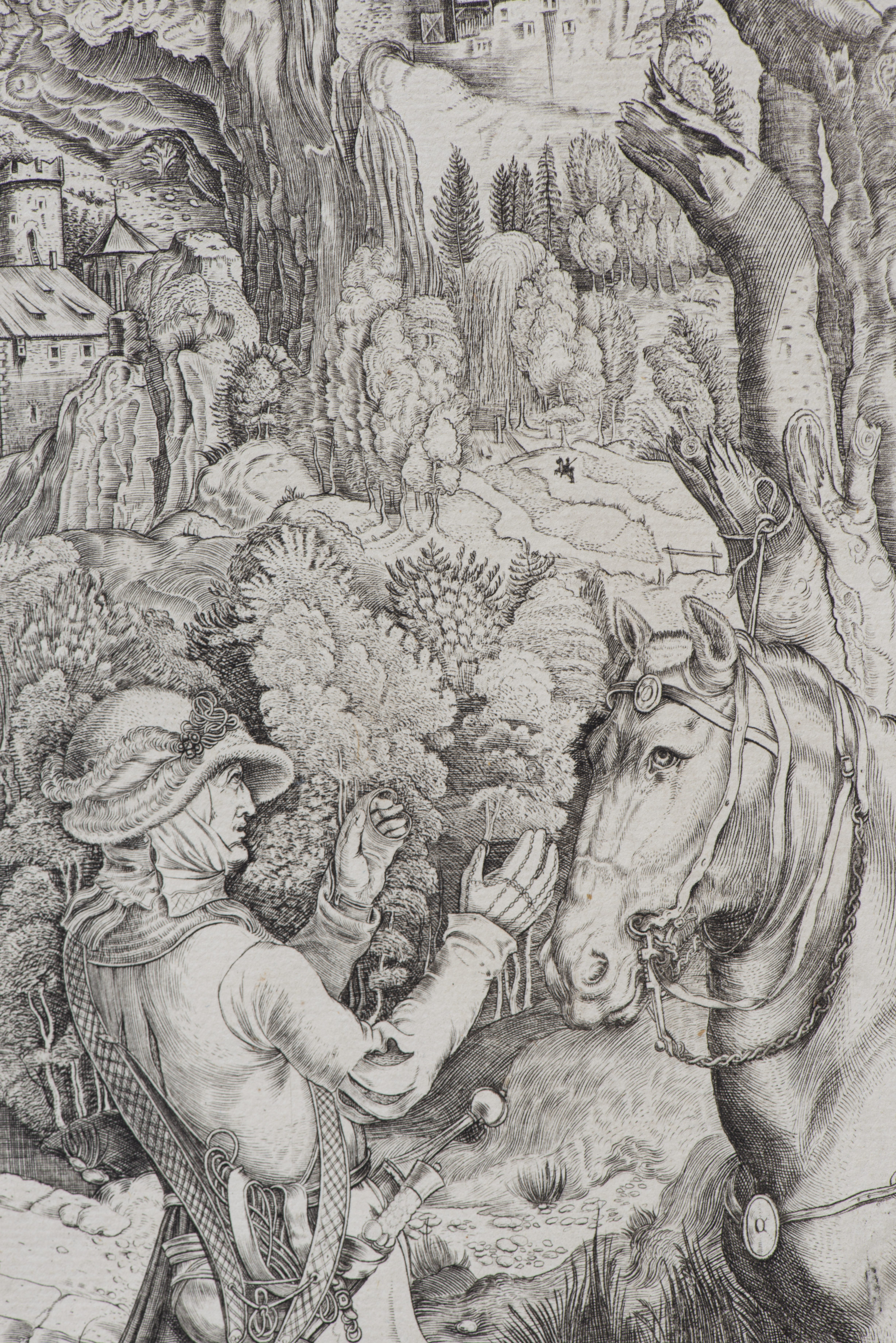 Albrecht Dürer (1471-1528) (d'après), Saint Eustache aussi nommé Saint Hubert, gravure sur cuivre. Monogrammé au centre en interne de la feuille. Cachet de collection au dos en haut à droite.