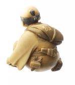 JAPON - Meiji - Netsuke en ivoire représentant un personnage laçant sa chaussure