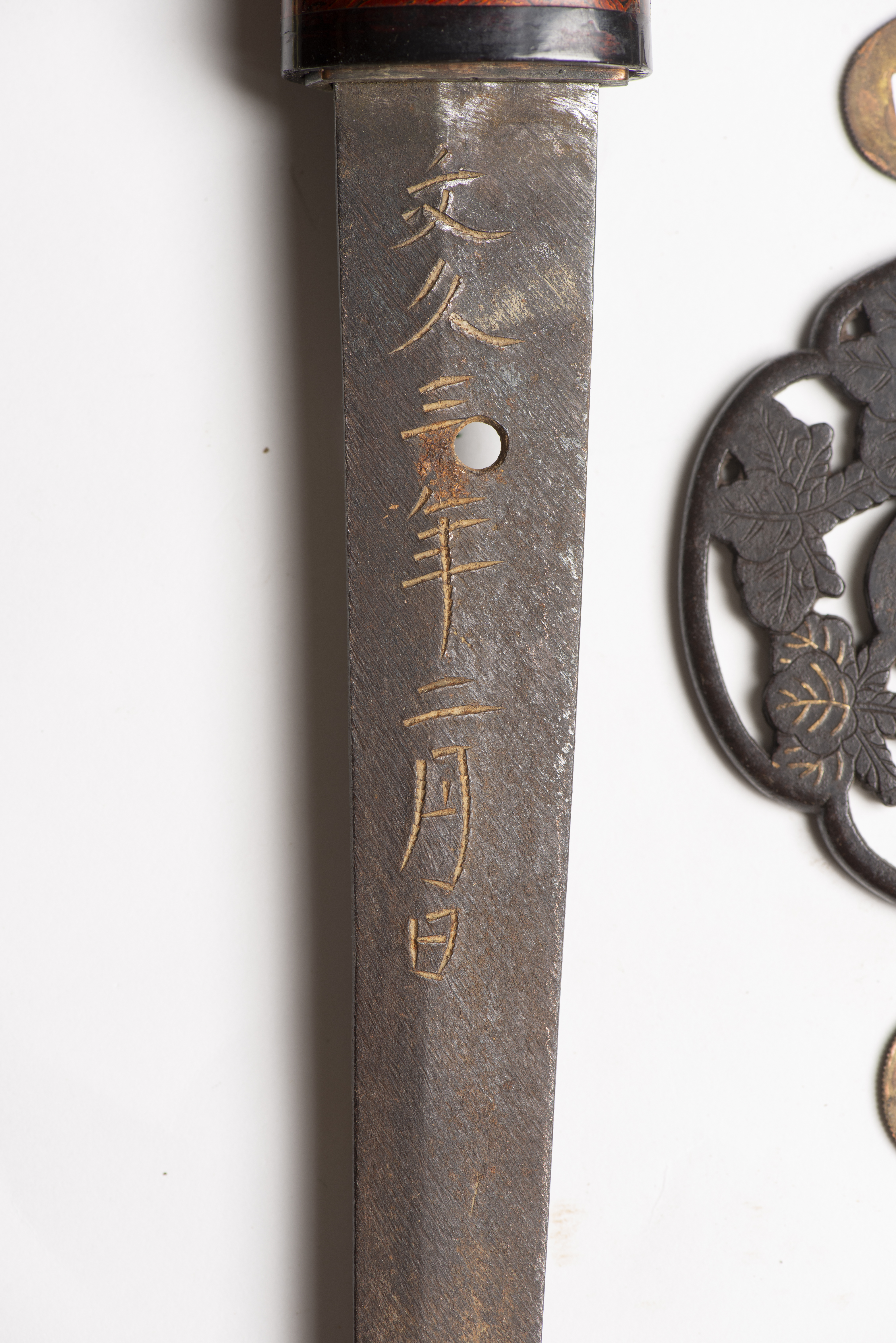 La lame, longue et effilée, à dos iori mune, présente plusieurs manques au tranchant dus à l’usure et de nombreuses marques sur toute sa longueur, signée "