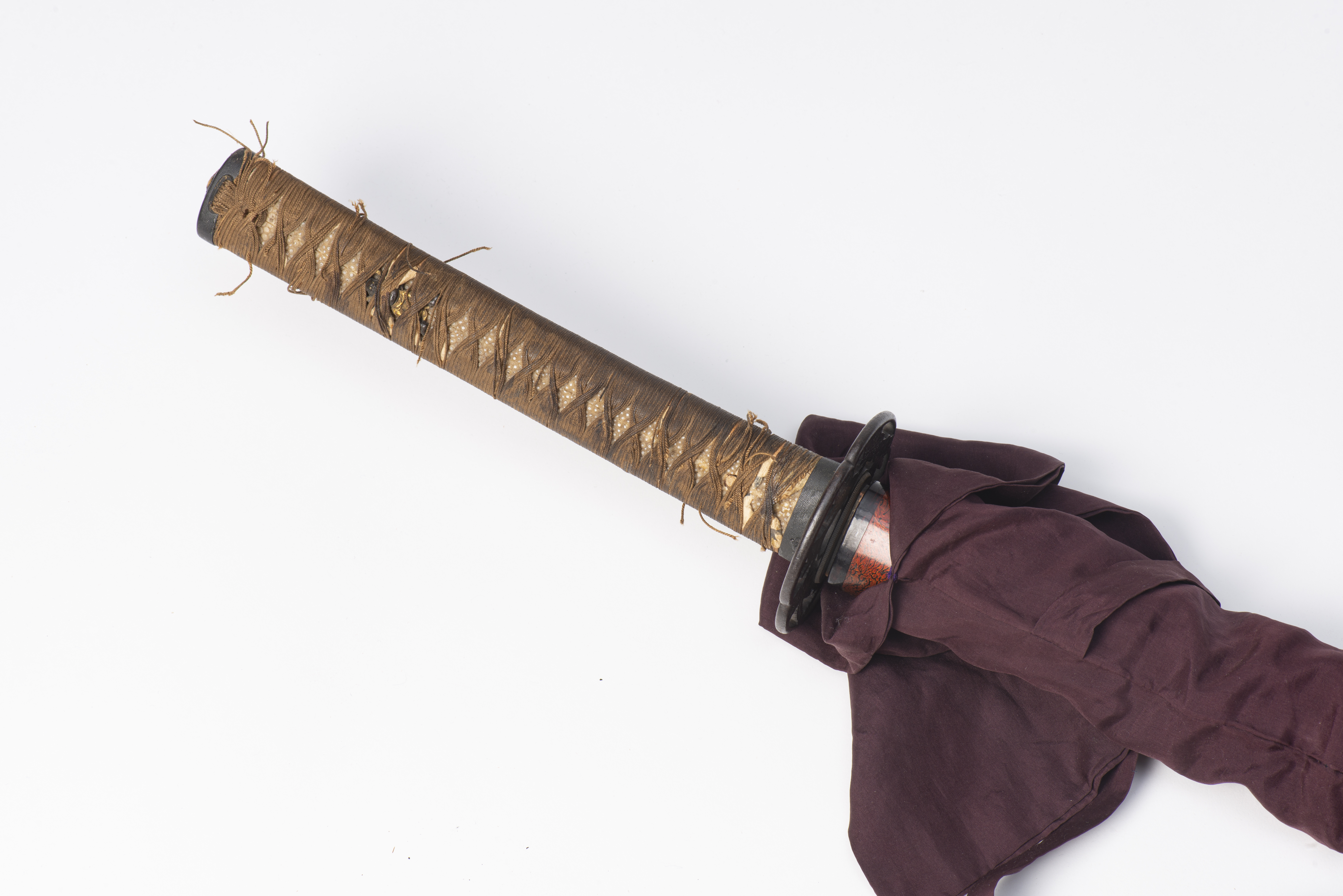 JAPON - Katana, Fin de l'époque Edo, le saya en bois laqué rouge et noir negoro-nuri, muni d’un koiguchi usé, d’un kuri-gata en bois laqué noir dépourvu de sageo, et incomplet de son kojiri. La poignée tsuka en tressage ito jaune-brun, échevelé et partiellement détaché, sur fond en galuchat blanc jauni, comprend une paire de menuki en forme de divinités guerrières. Le kashira en métal orné d’un coq et de fleurs rehaussés d’or est assorti au fuchi gris décoré également d’un coq et poussins sur fond nanako. La tsuba mokko-gata en shibuichi à décor ajouré en maru bori de fleurs de paulownias.