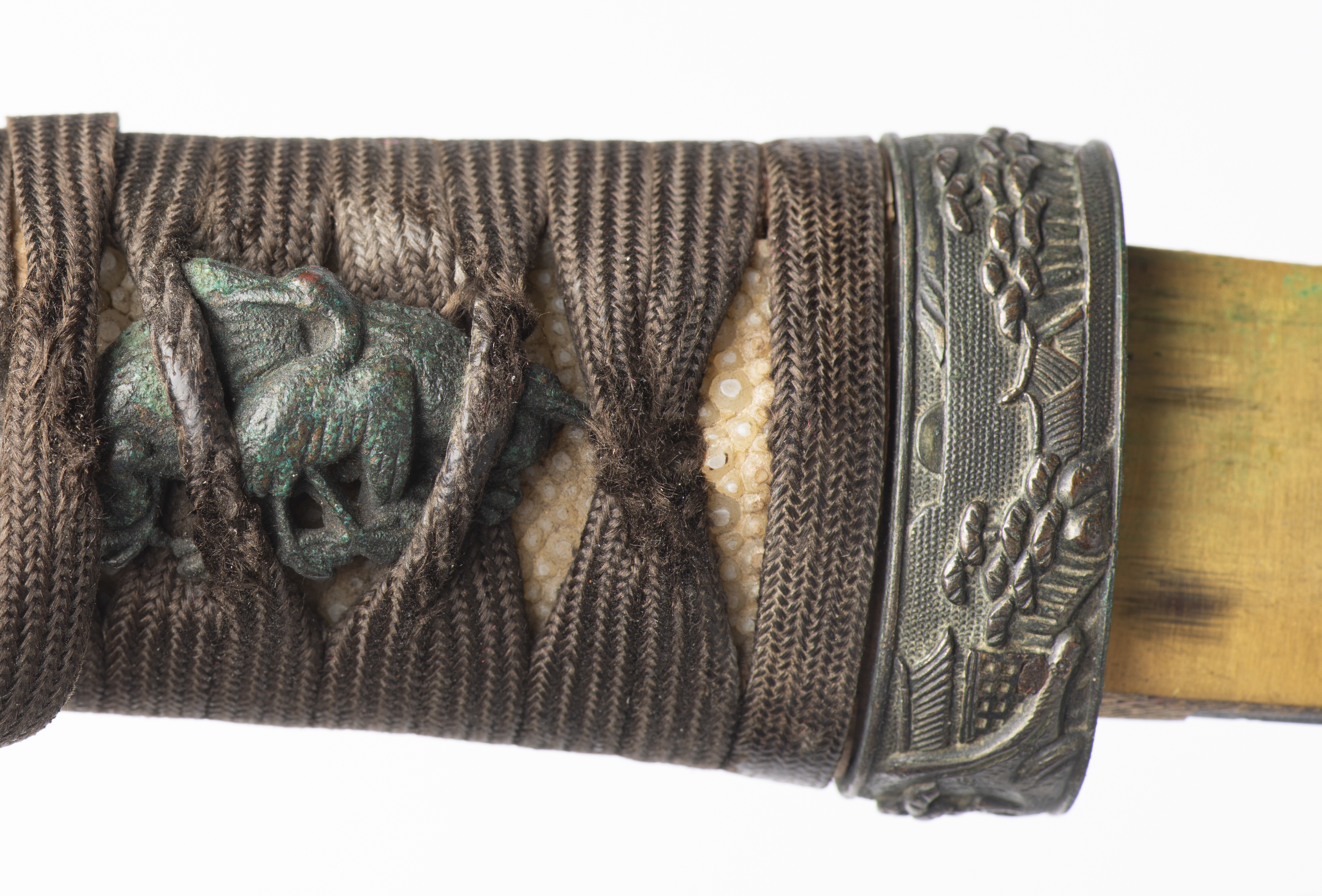 La lame présente des salissures et éclats au tranchant, oxydations des éléments, usures sur le saya.