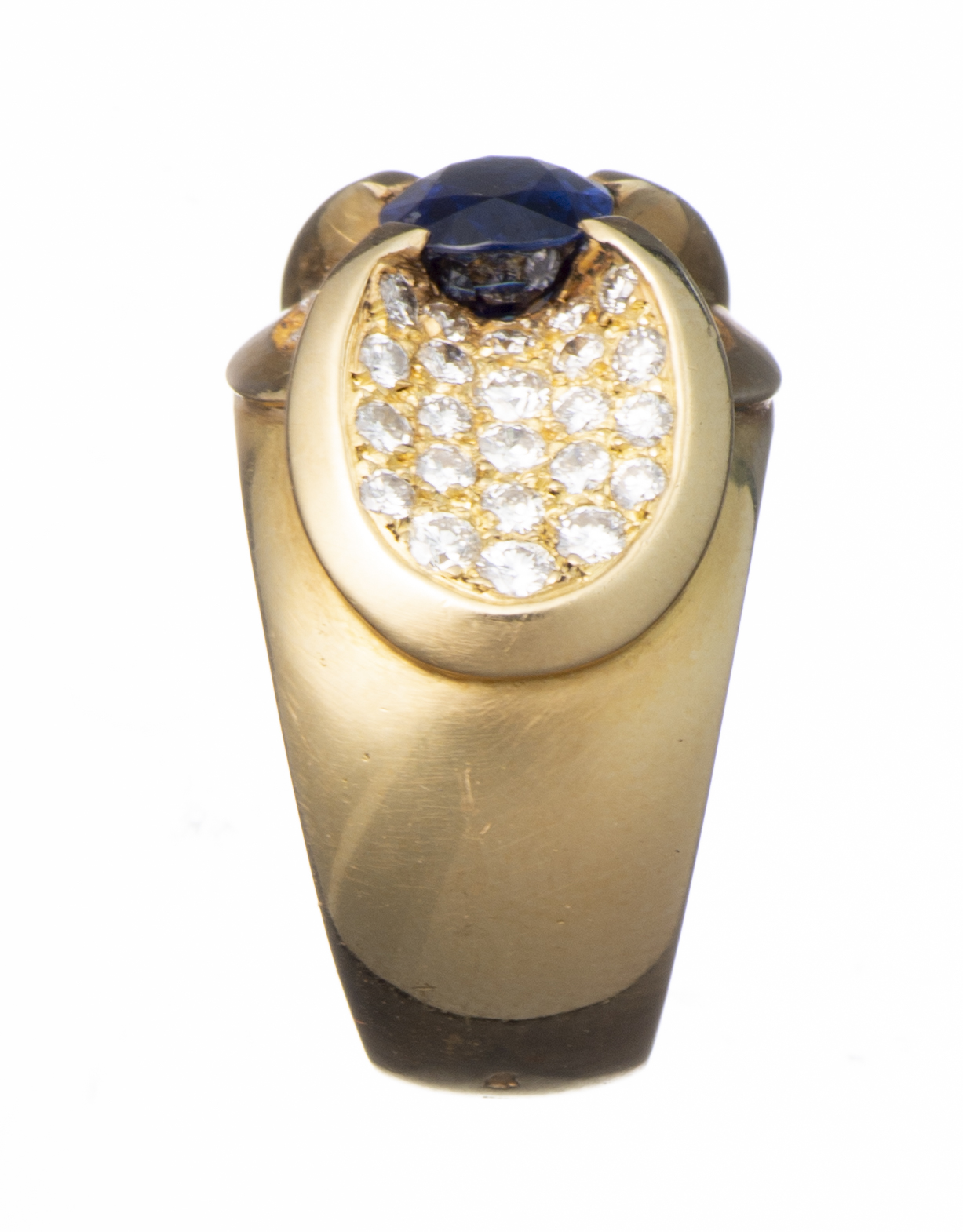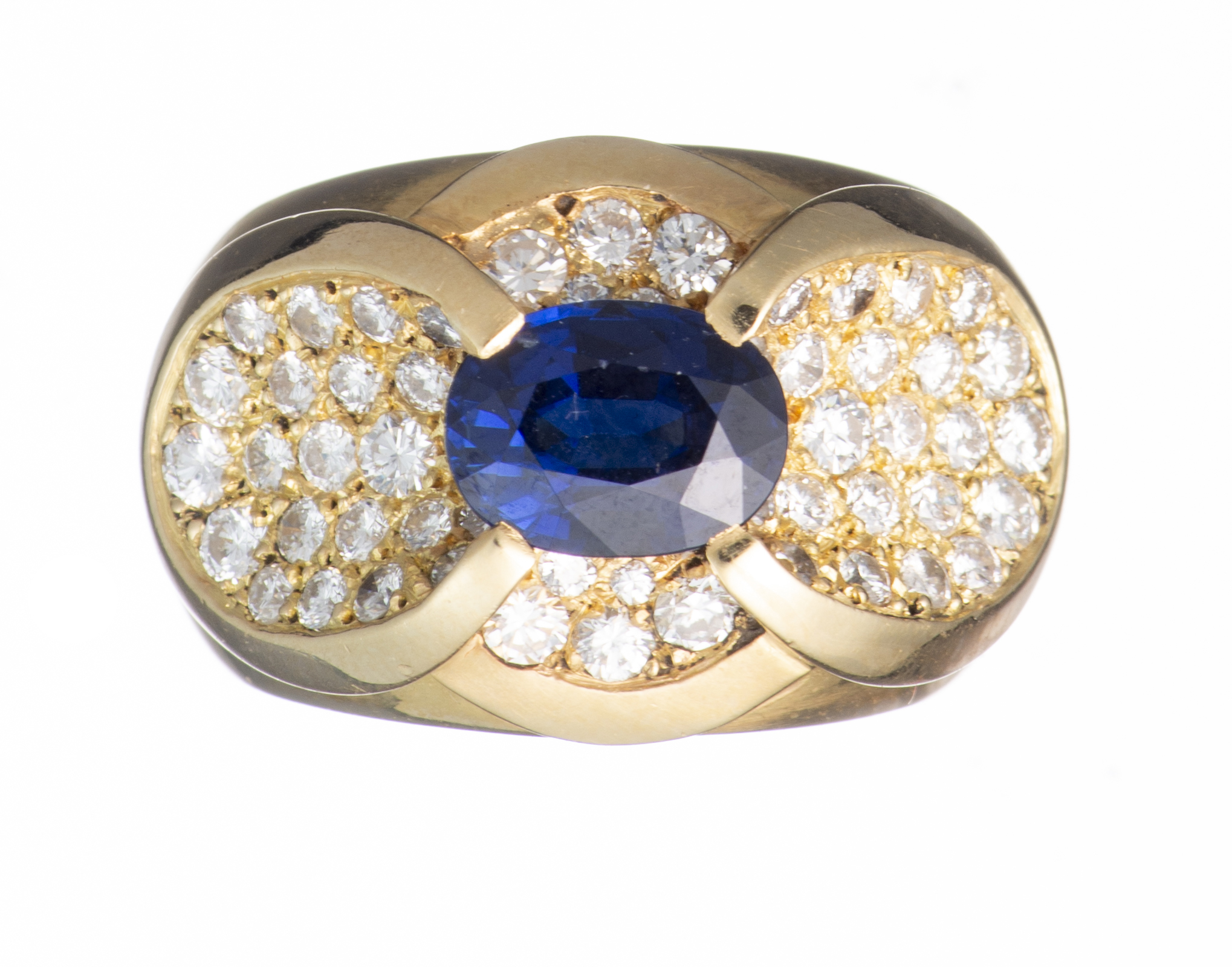 Bague en or jaune .750 sertie au centre d'un saphir bleu ovale d'env. 1.60 ct et de 52 diamants de taille brillant pesant env. 2.50 cts.