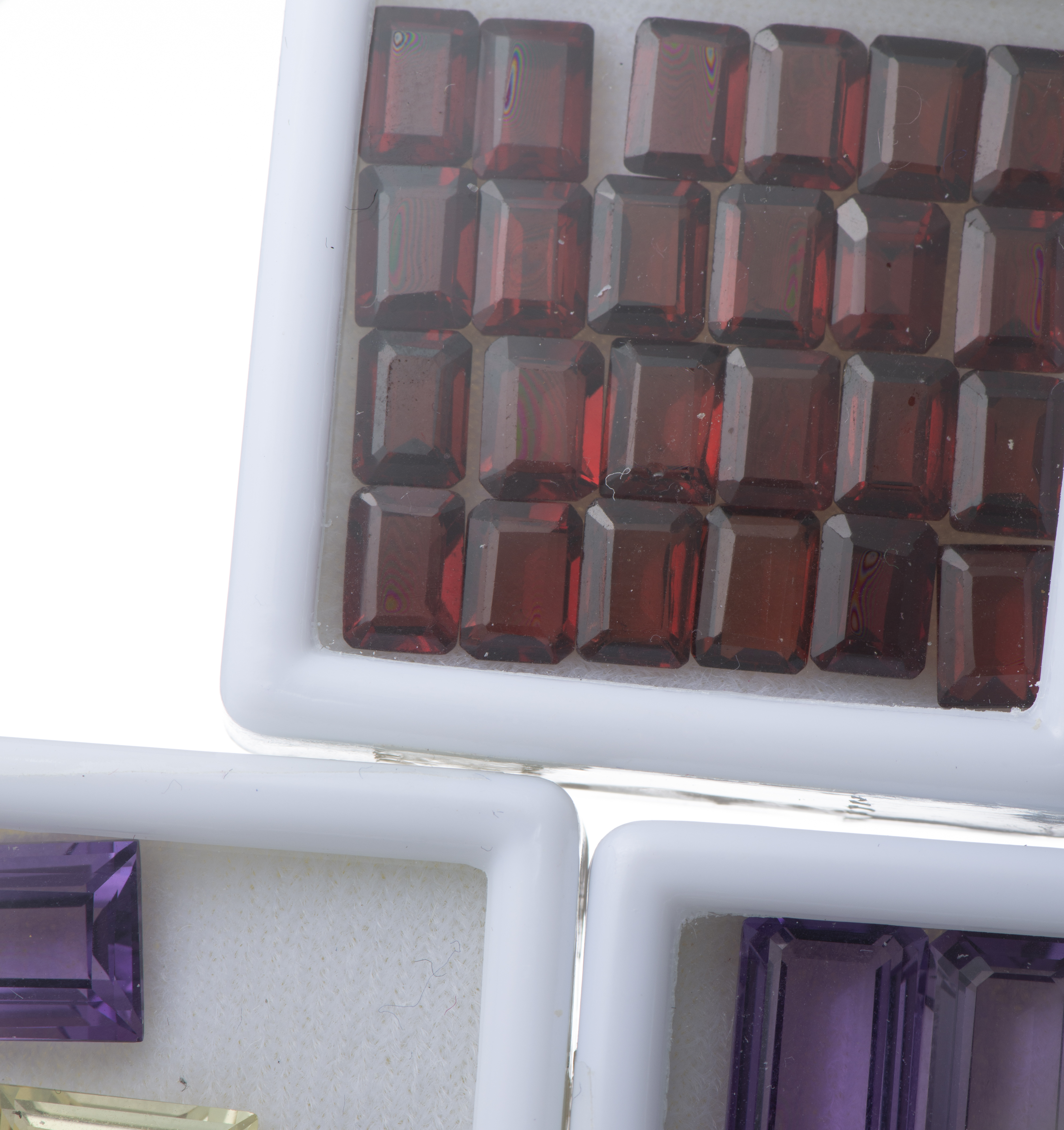 Ensemble de 3 lots de pierres fines non montées, composés d'améthystes, citrines,  quartz fumé et grenats pour un poids total d'env. 80 cts.