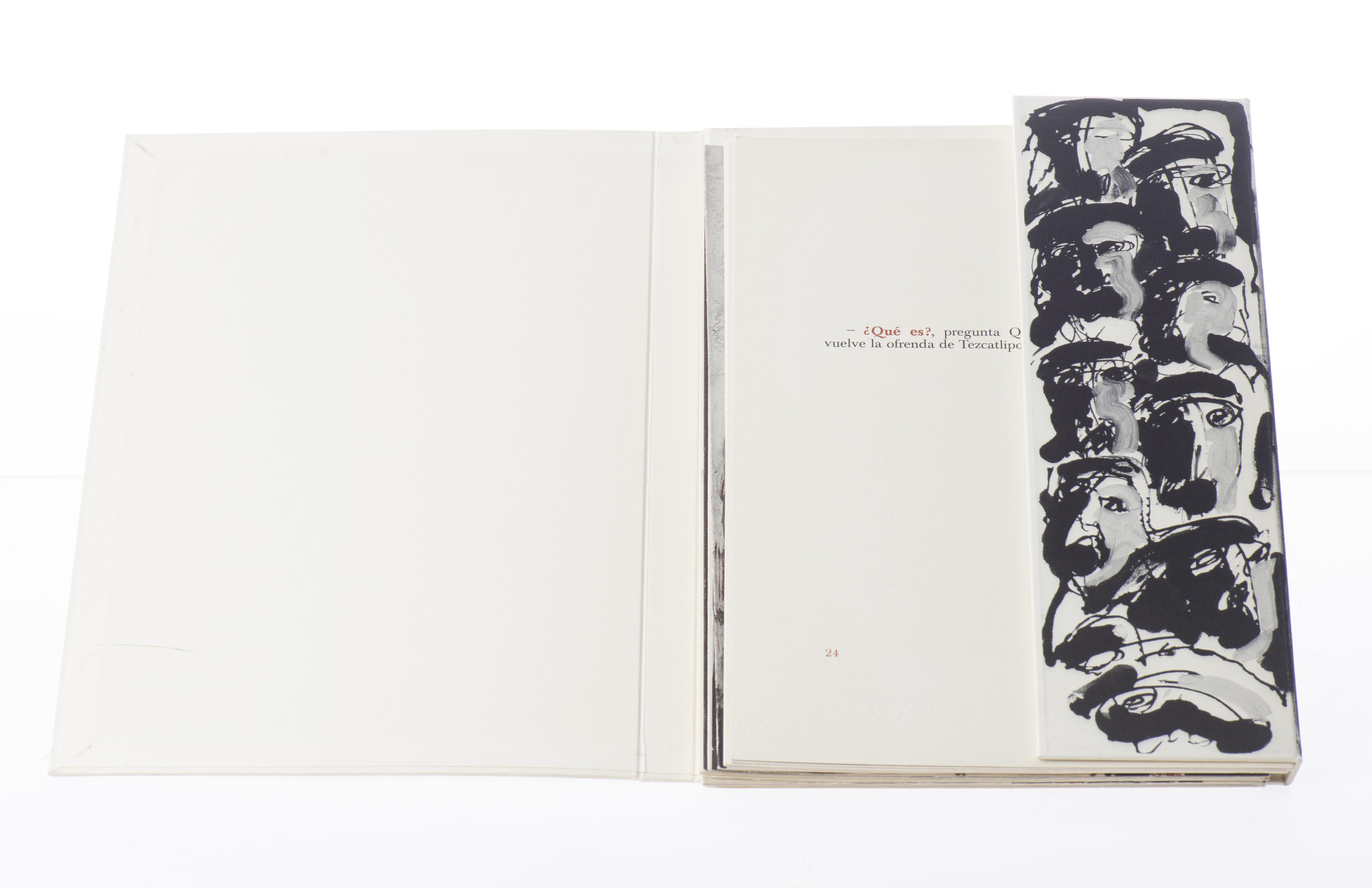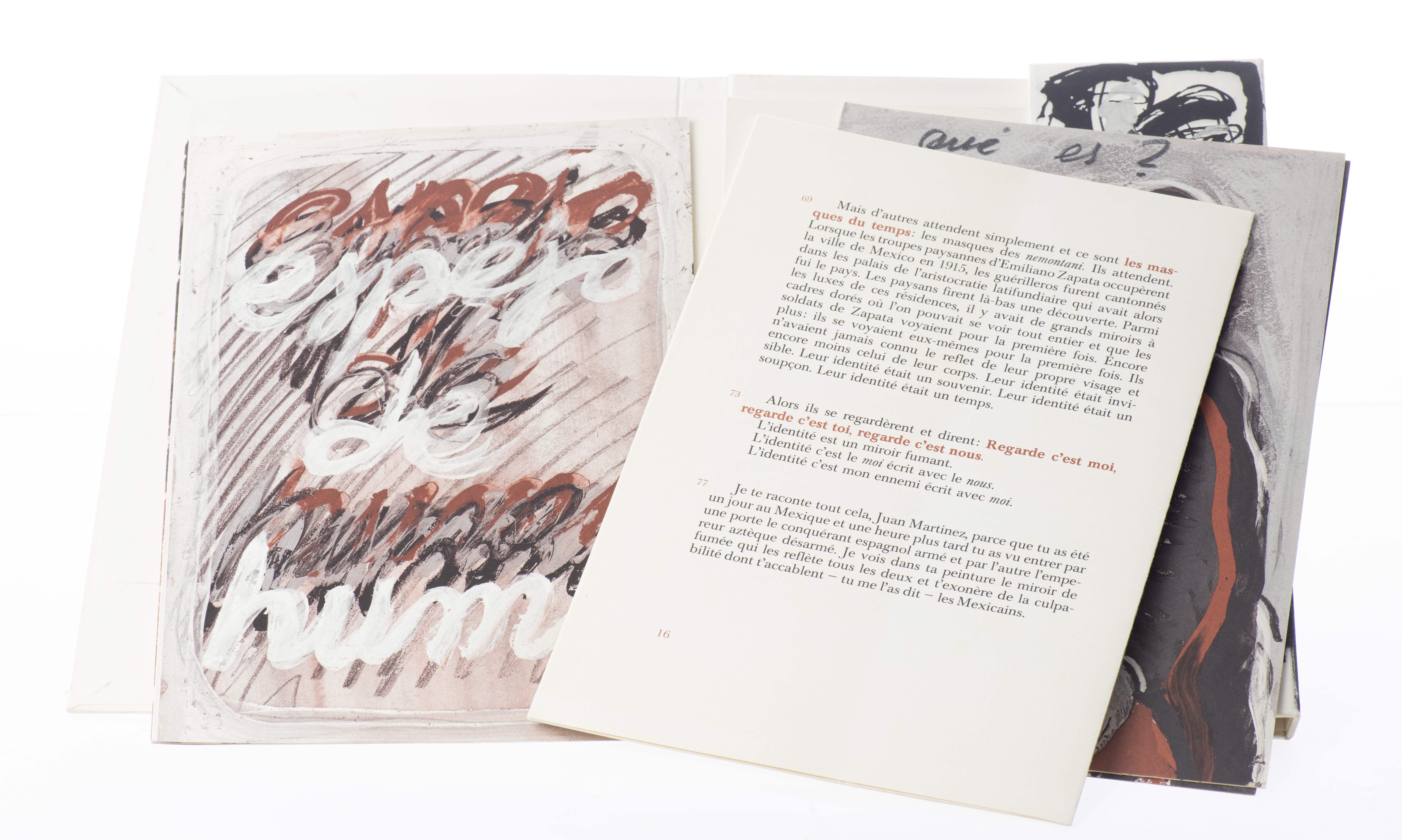 Carlos FUENTES (1928-2012), "Miroir de Fumee pour Juan Martinez / Espejo de Humo para Juan Martinez", Lausanne, 1980. Exemplaire composé de 83 pages sur feuillets détachés réunis dans un emboîtage richement orné par l'artiste. Exemplaire n° 204/500 HC
