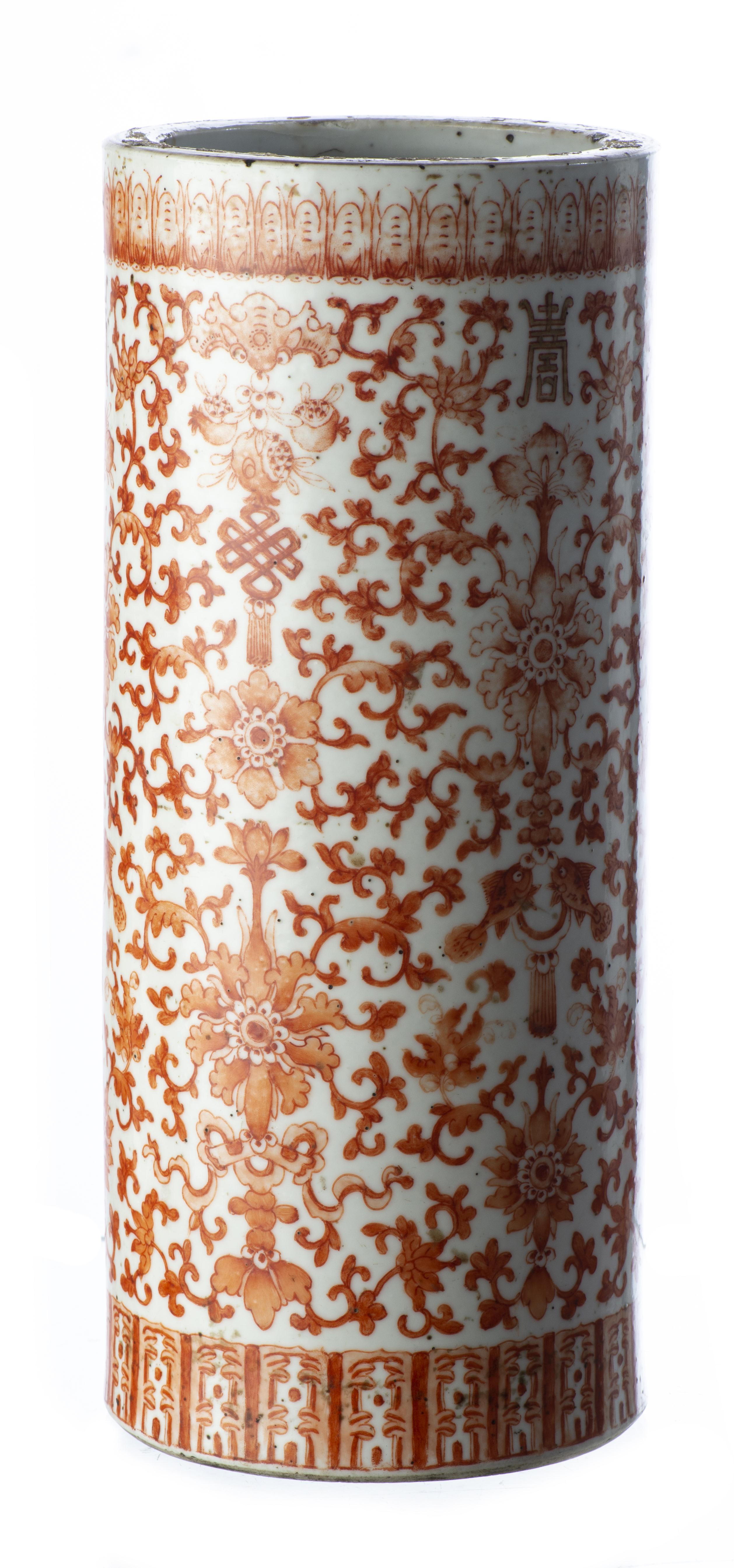 On y joint un vase tubulaire en porcelaine de Chine à décor en rouge de fer de fleurs de lotus, d'objets de lettrés , de symboles Shou en caractères dorés, avec une frise de chauve-souris au col, les 3 pêches, les 3 grenades, les 3 citrons digités, les deux poissons, le nœud infini, la pièrre sonore, letout dans des entrelacs de feuillages au dessus d'une frise de feuilles de feuilles de bananes styllisée. Marque en rouge de fer à 6 caractères apocryphe sous la base Da Qing Qianlong nian zhi.