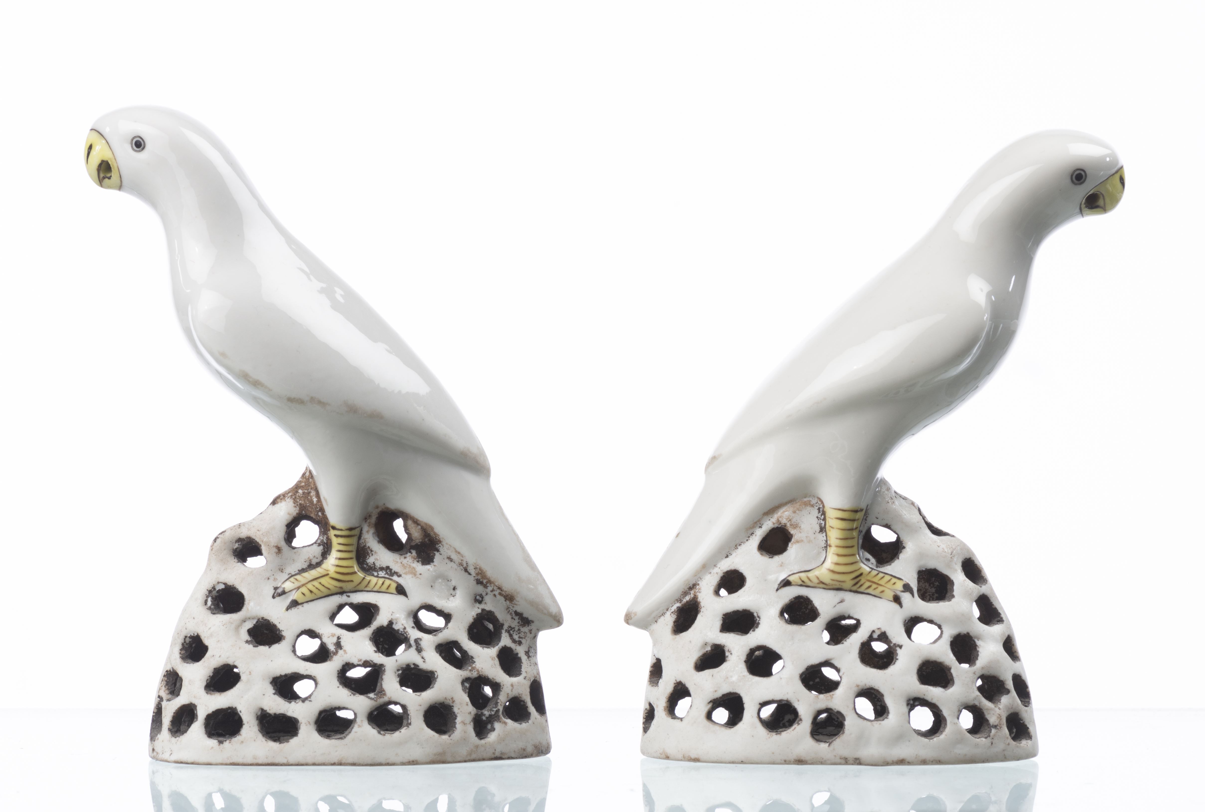 CHINE - Compagnie des Indes - Deux perroquets en porcelaine blanche et becs à glaçure jaune à rehauts de noir.