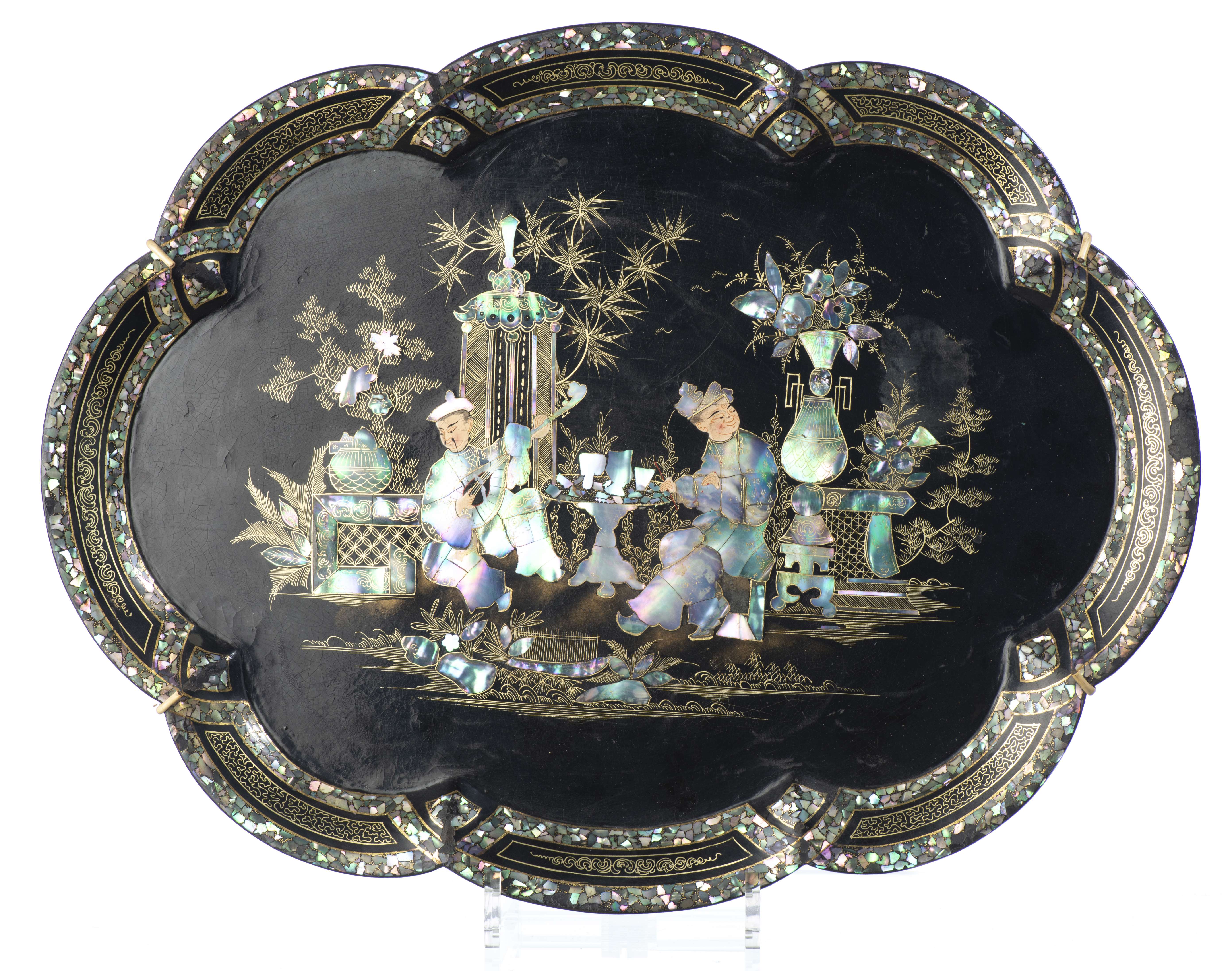 CHINOISERIE, Paire de plateaux polylobés en papier mâché laqué à décor d'une scène de chinois en nacre noire et surdécor à l'or. Epoque Nap. III.