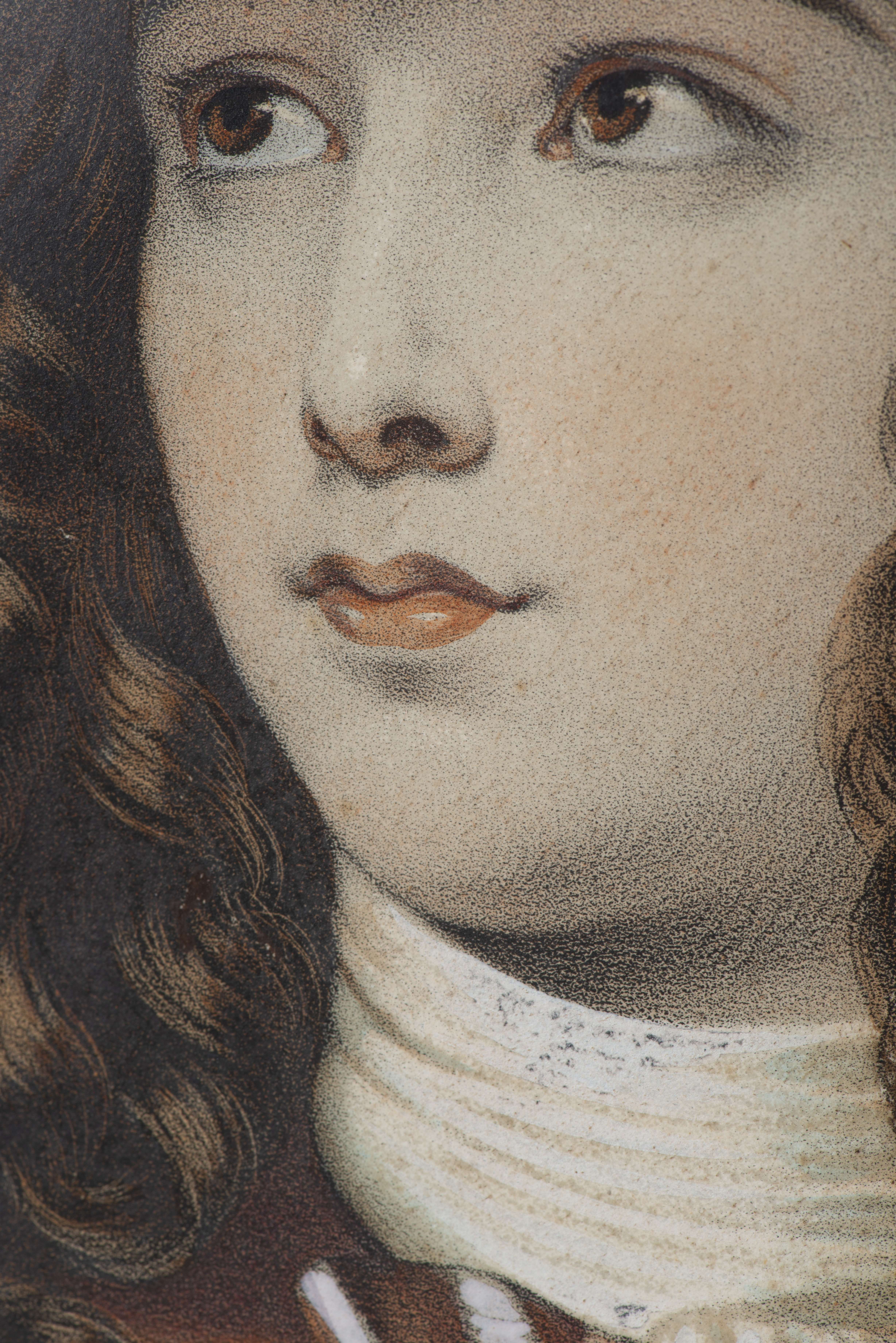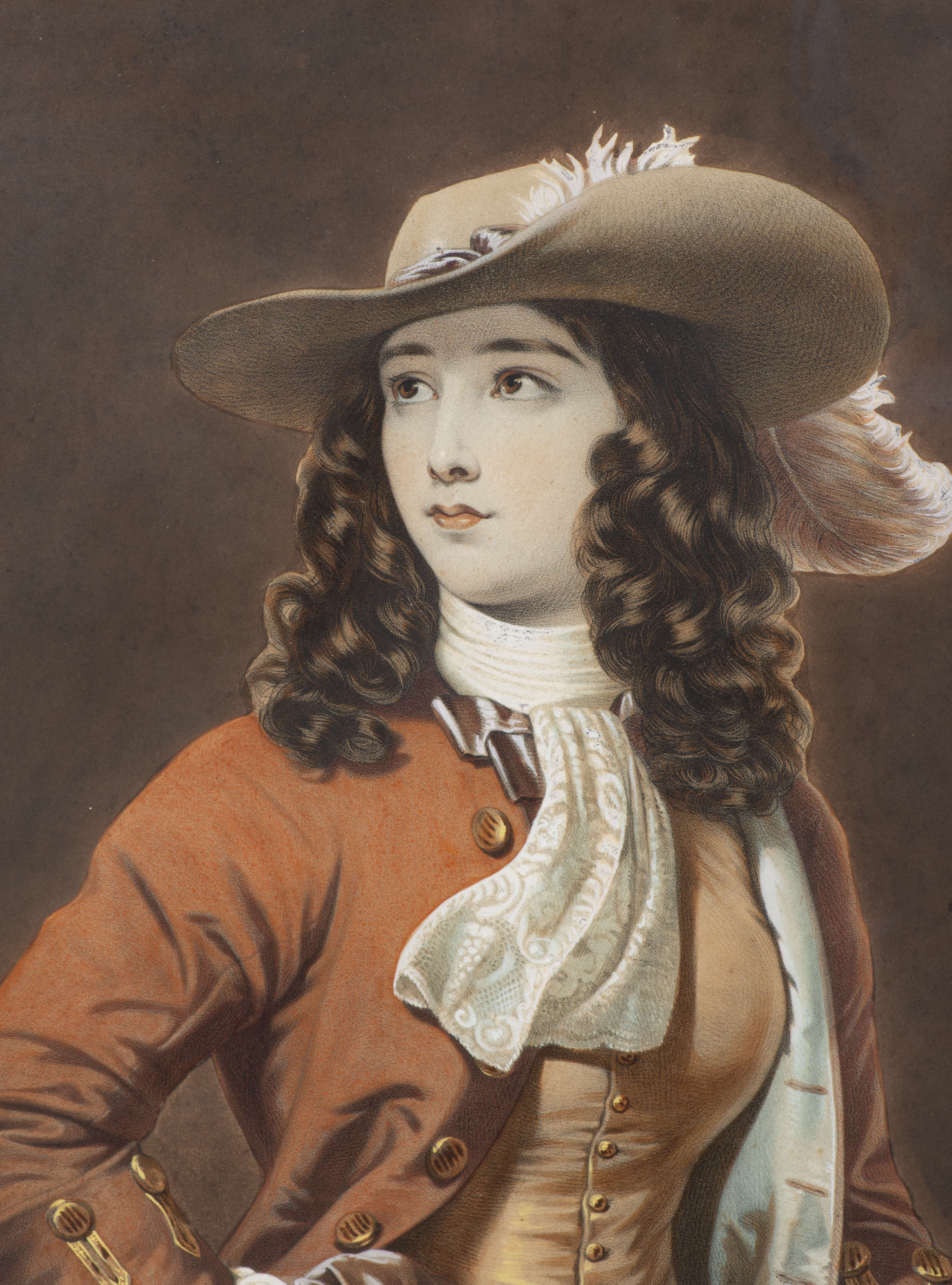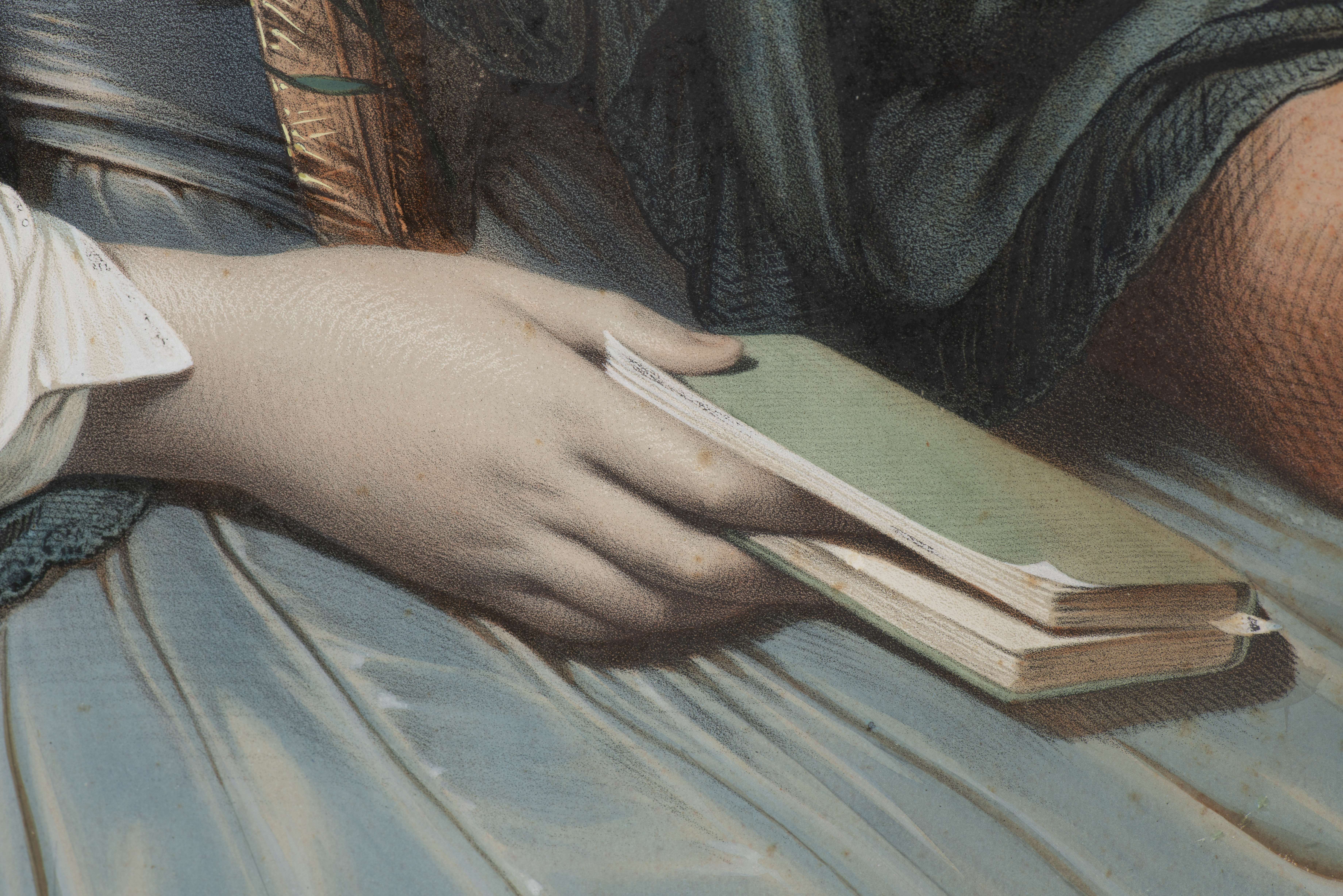 Ecole italienne début XIXe, 'Jeune-fille au chapeau à la mousquetaire' et 'Jeune-fille assise, avec un livret', Ensemble de deux gravures aquarellées.