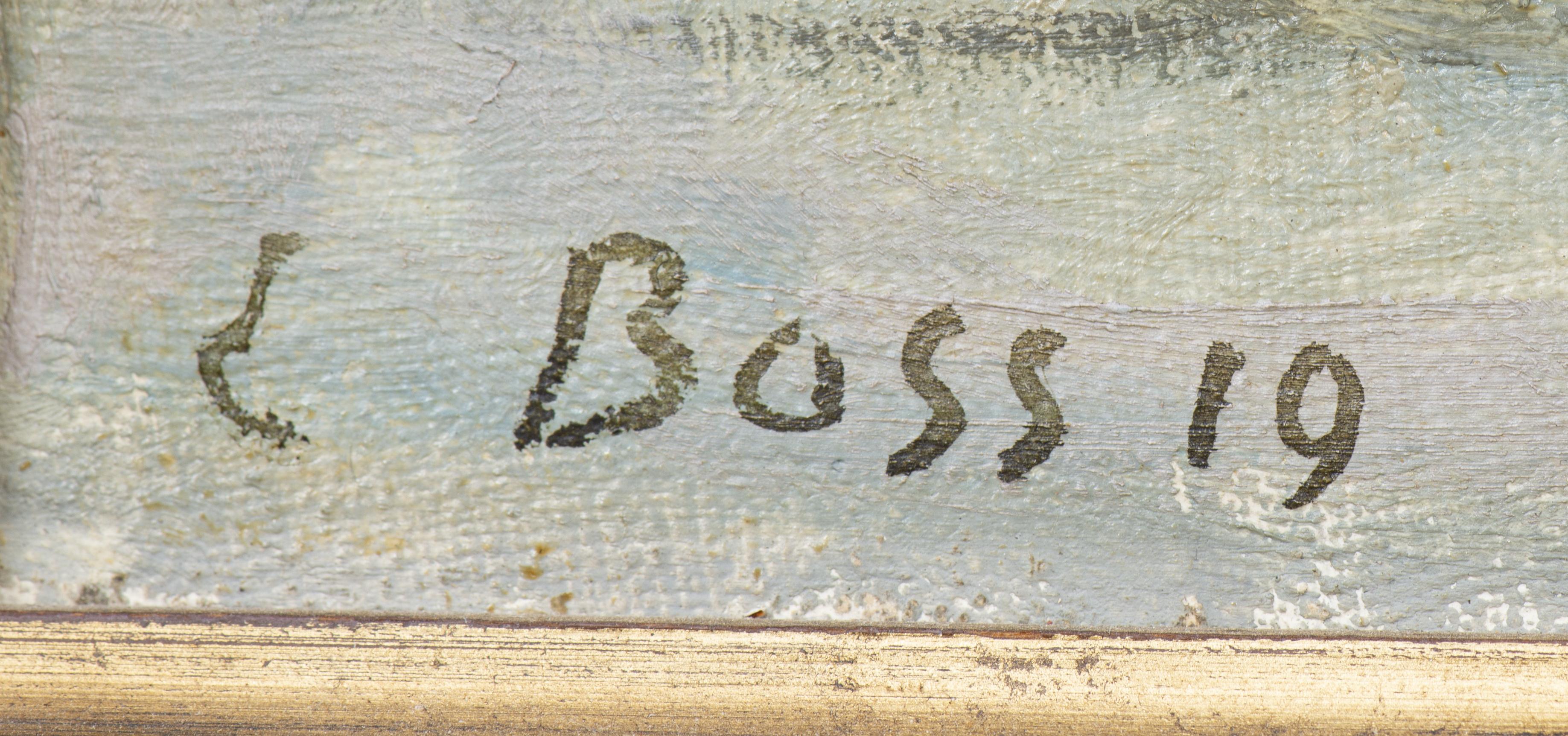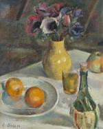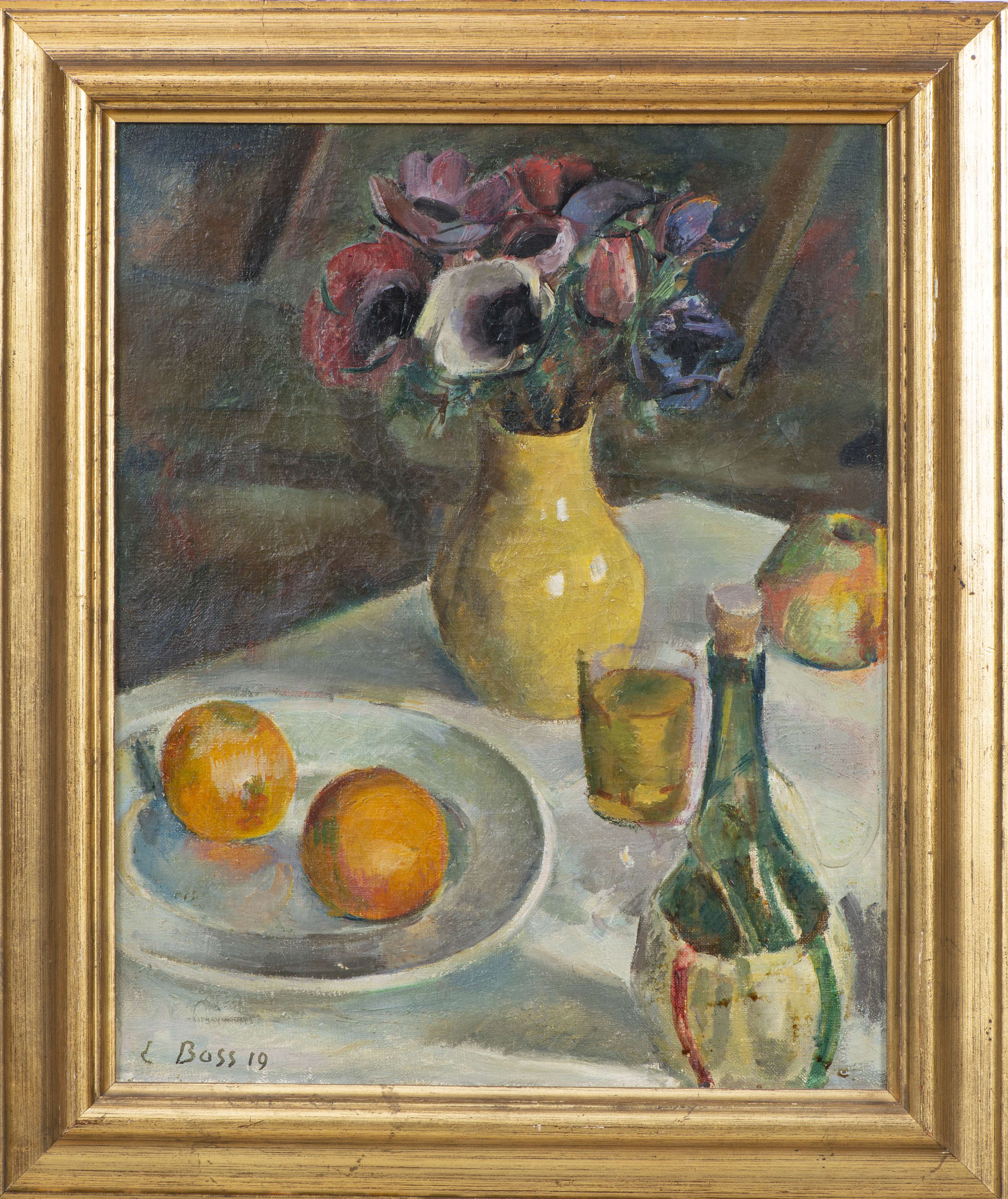 Eduard BOSS (1873-1958), 'Nature morte aux fruits et à la bouteille et au vase de fleurs', huile sur toile signé en bas à gauche et daté 1919.