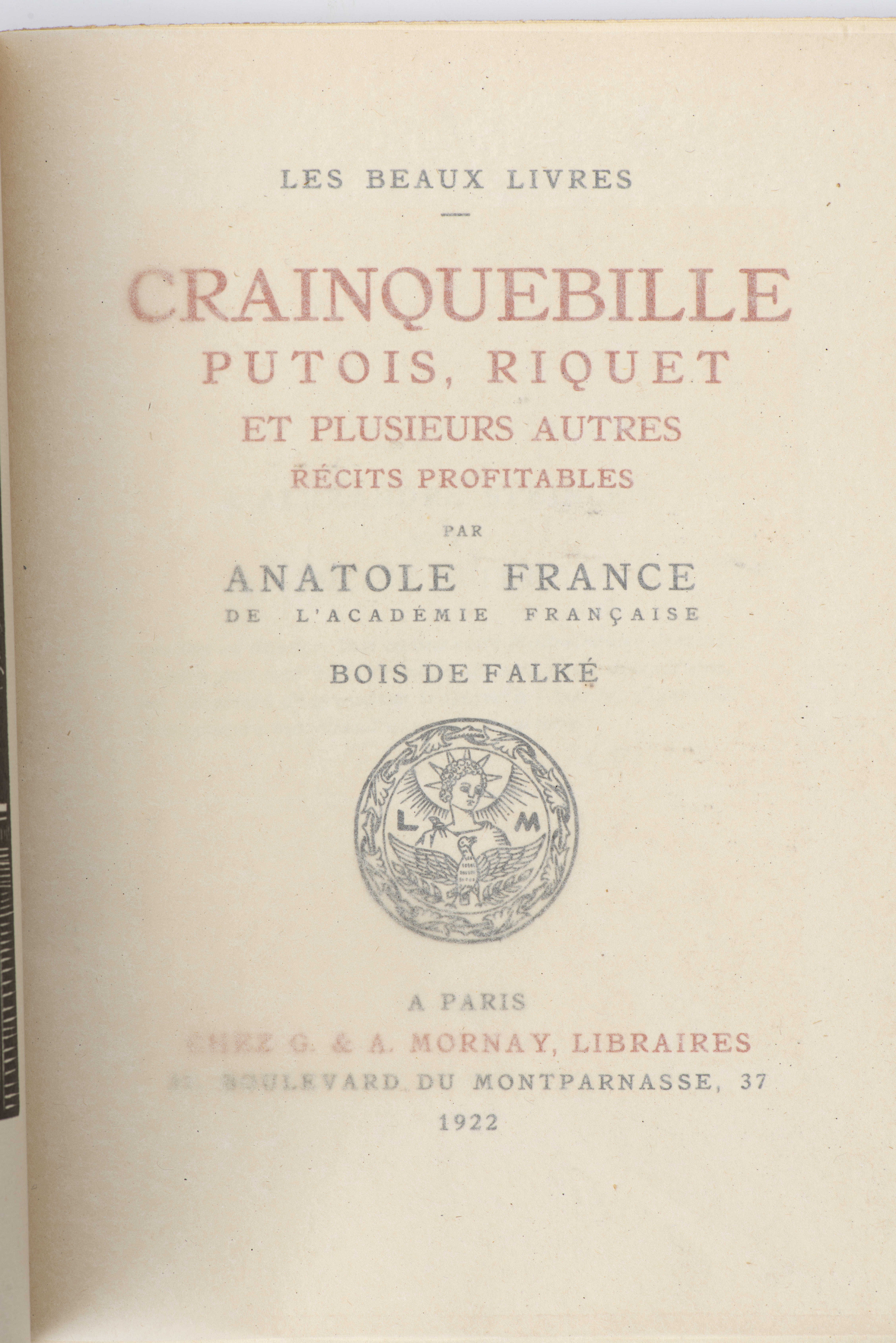 - "Crainquebille, Putois, Riquet et plusieurs autres réçits profitables", Paris, 1922, In-8, papier Rives.