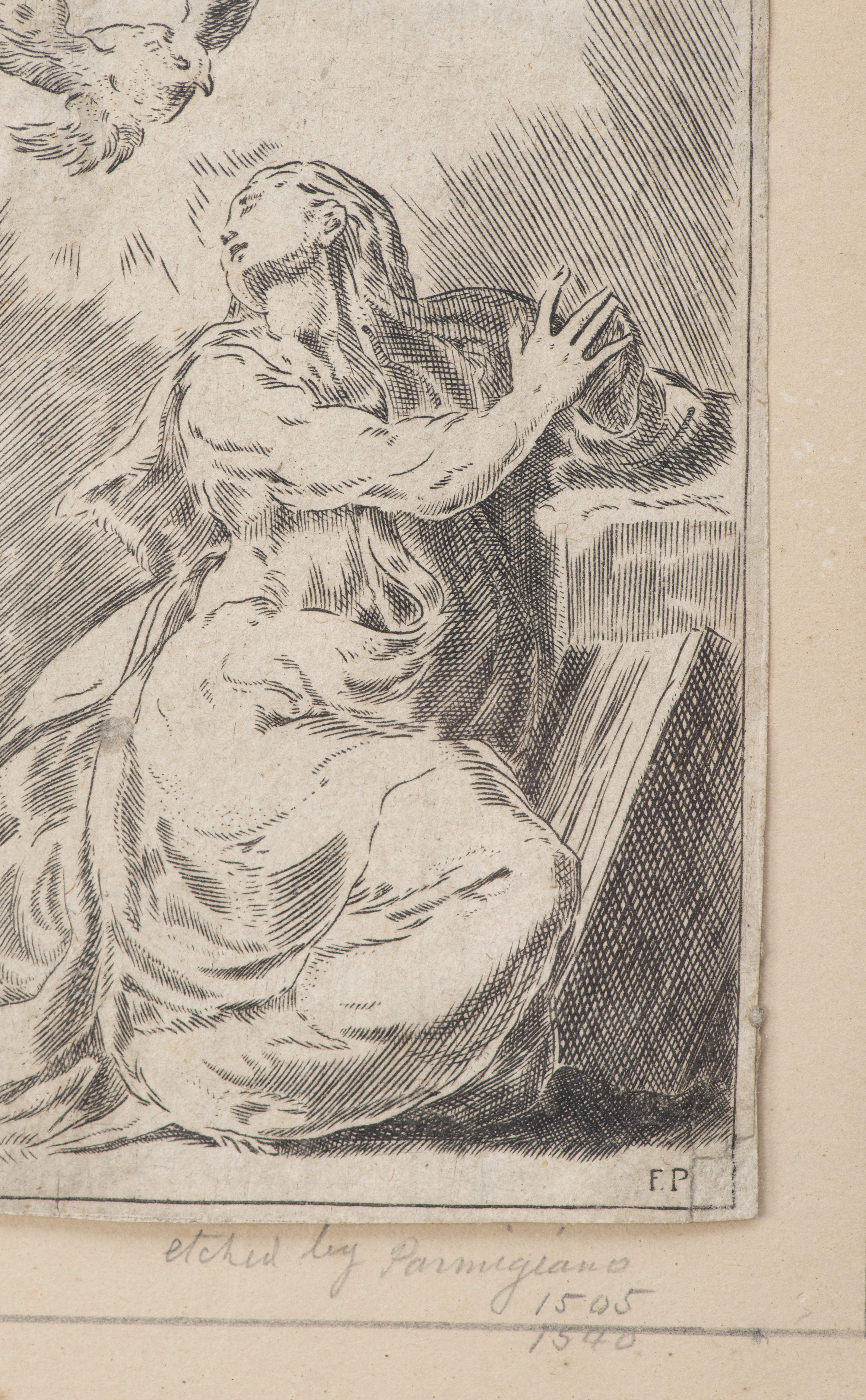 Girolamo Francesco Maria Mazzola PARMIGIANO (1503-1540), "L'annonciation" eau-forte sur papier, mon FP en bas à droite.