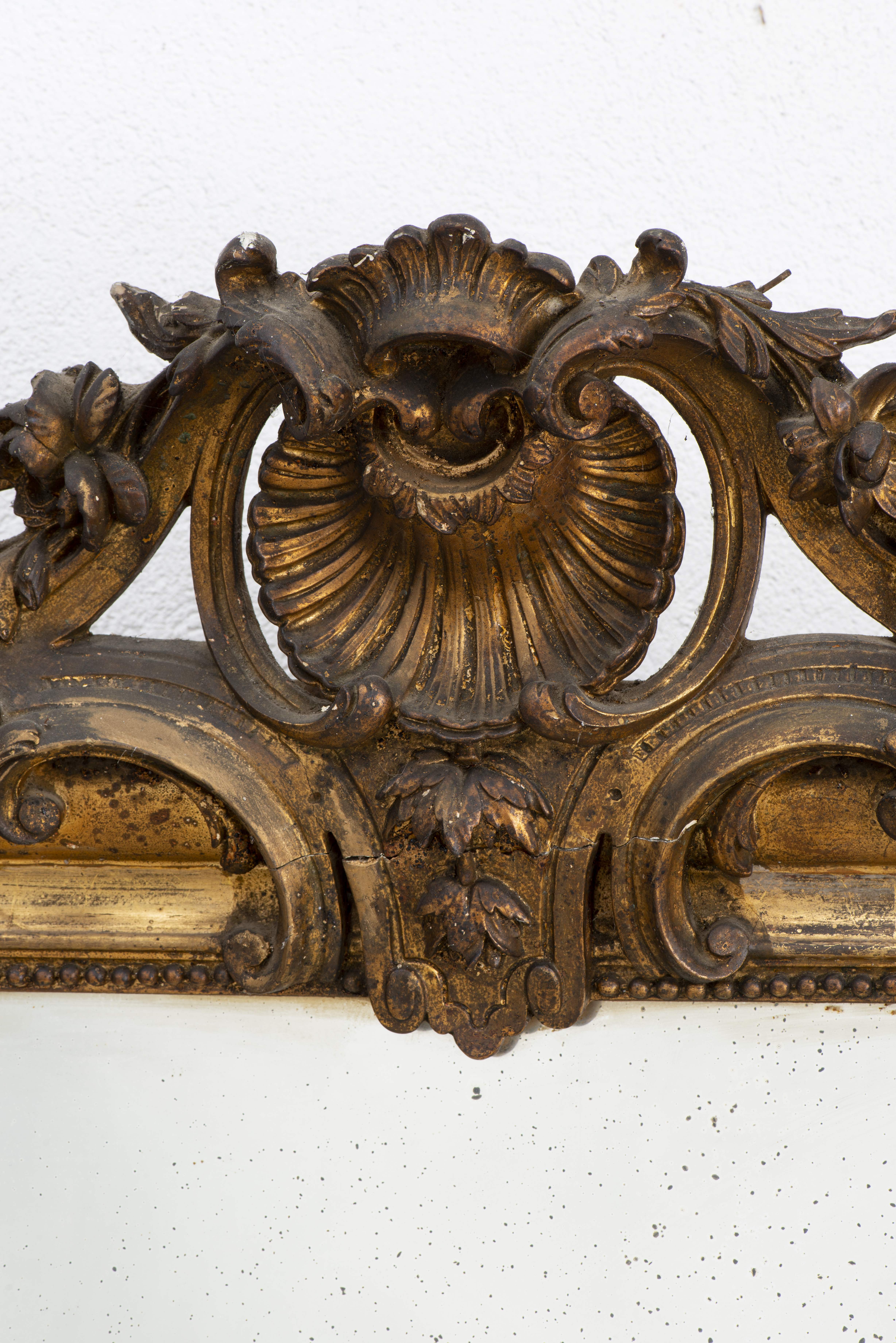 Grand miroir de cheminée de style Louis XVI et d'époque Napoléon III à encadrement en stuc doré à fronton à la coquille, miroir au mercure.