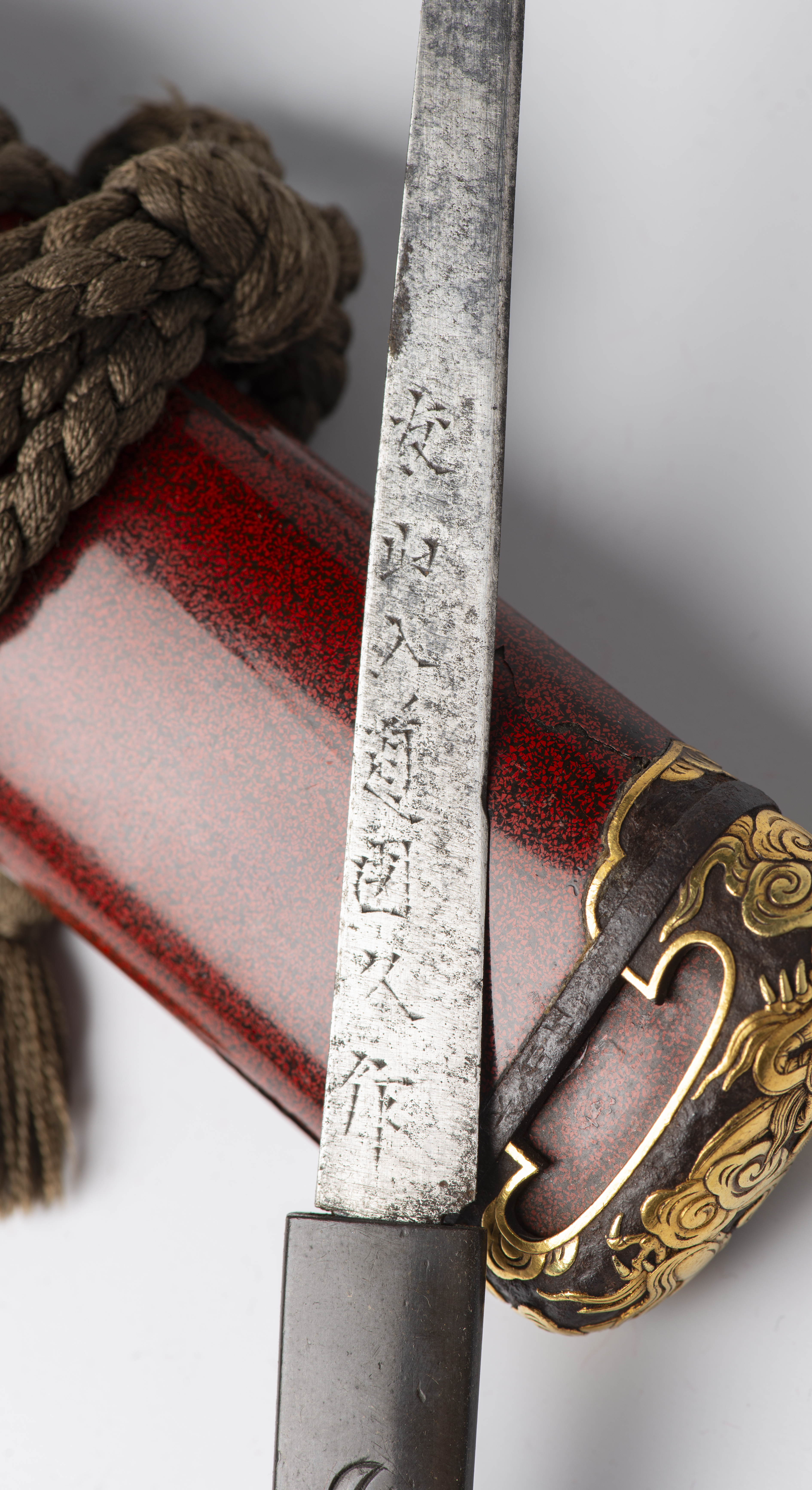 JAPON - Kaiken, du XIXe siècle, le fourreau saya en laque rouge, muni d’un koiguchi, d’un sageo brun-doré enroulé autour du fourreau, et d’un kuri-gata en bois laqué noir, se termine par un kojiri en métal décoré d’un dragon parmi les nuages. La poignée tsuka en tressage sageo brun-doré sur fond en galuchat blanc, comprend deux menuki dissimulés sous le tressage. Le kashira et le fuchi en fer finement ciselé à décor en taka bori de dragons parmi les nuages, le habaki en cuivre.