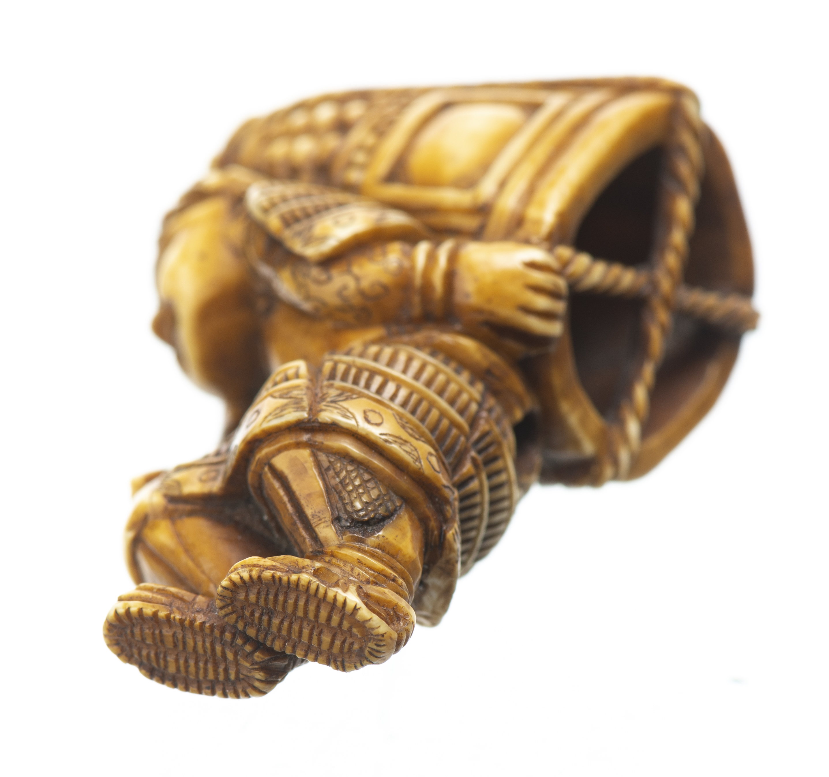 JAPON - Meiji - Netsuke en ivoire à patine jaune représentant un personnage portant une cloche