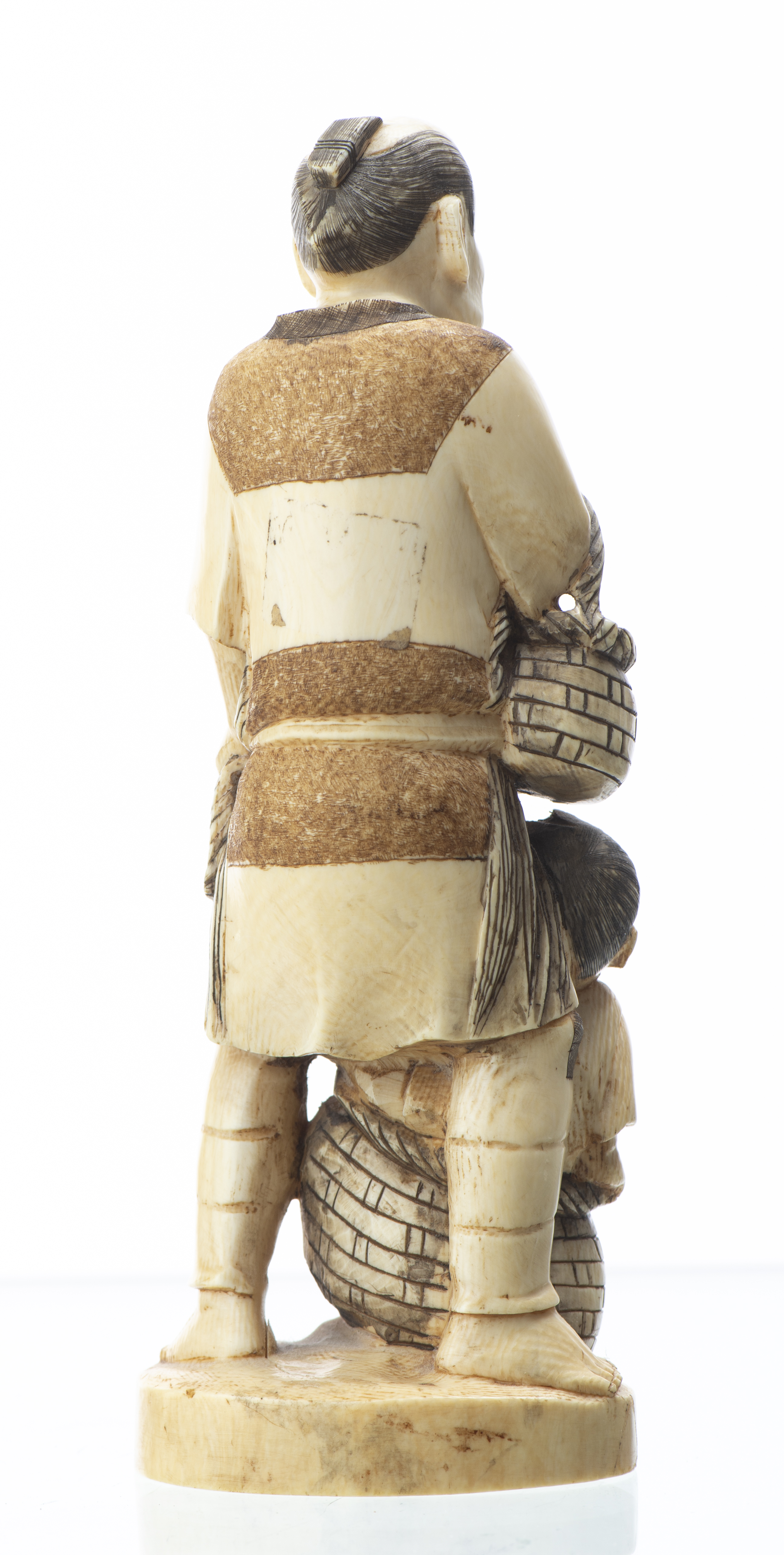JAPON - Okimono en ivoire, pêcheur accompagné d'un enfant