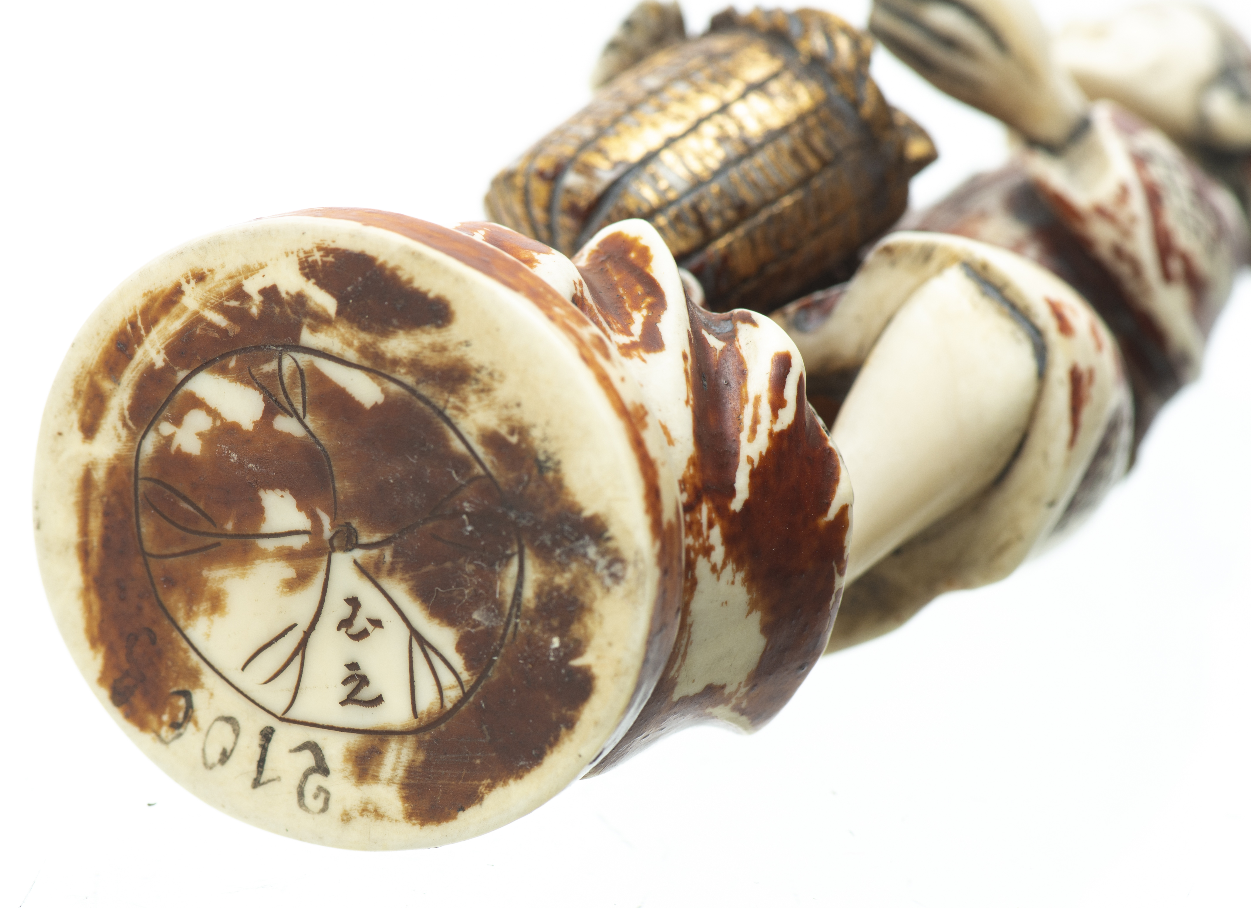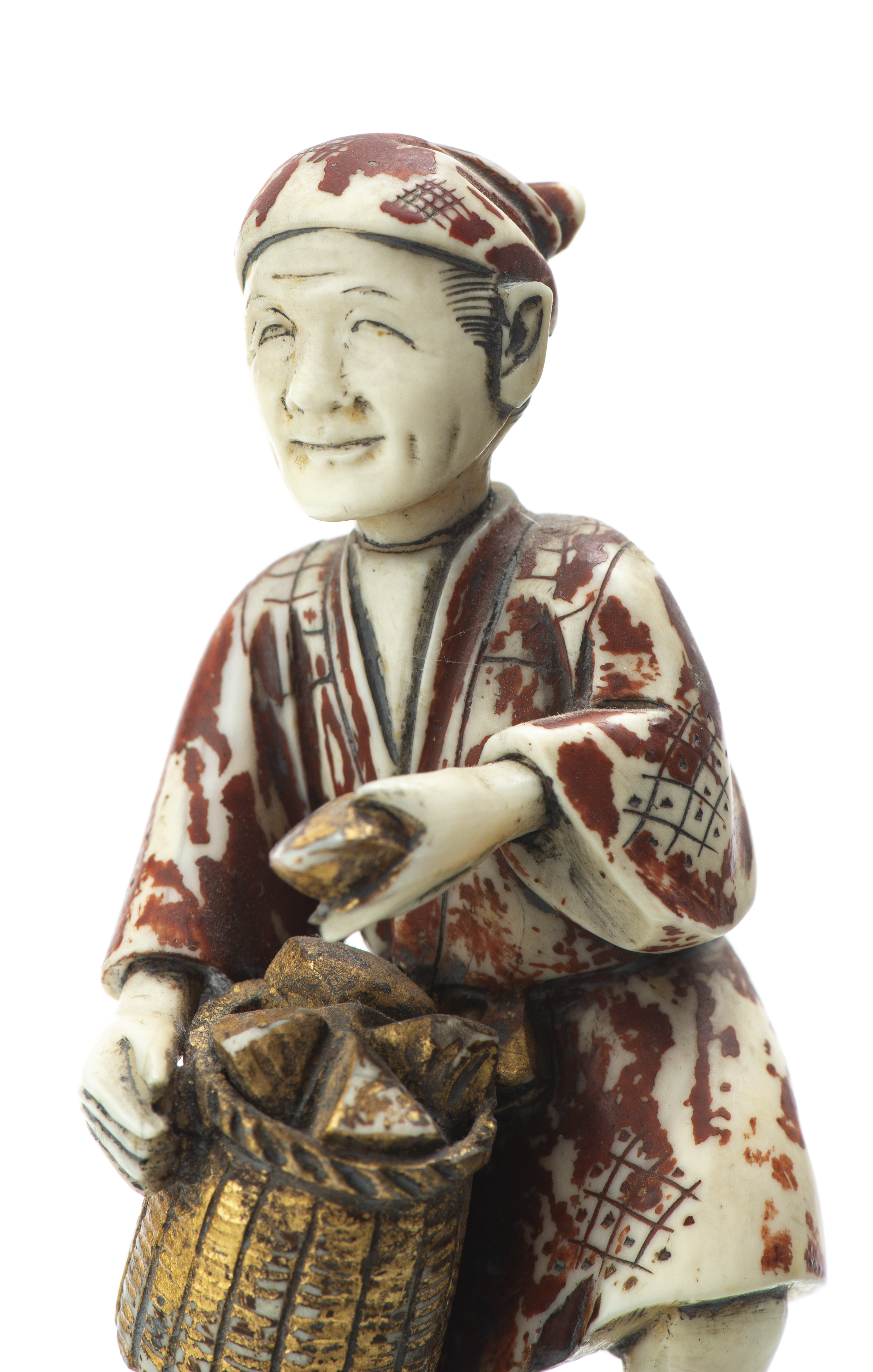 JAPON - Okimono en ivoire peint en rouge et or, marchand ambulant