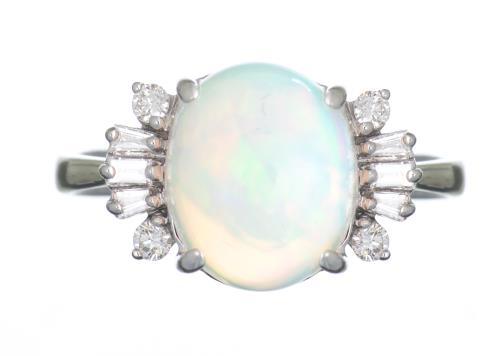 Bague en or gris sertie d'une opale ronde de env. 2.5 cts et 46 diamants baguette