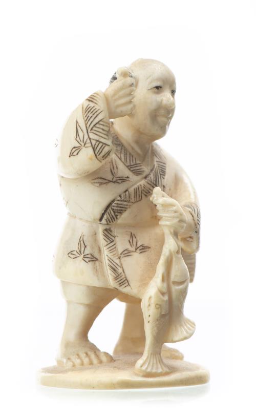 JAPON - Okimono en ivoire représentant un pêcheur accompagné d'une femme