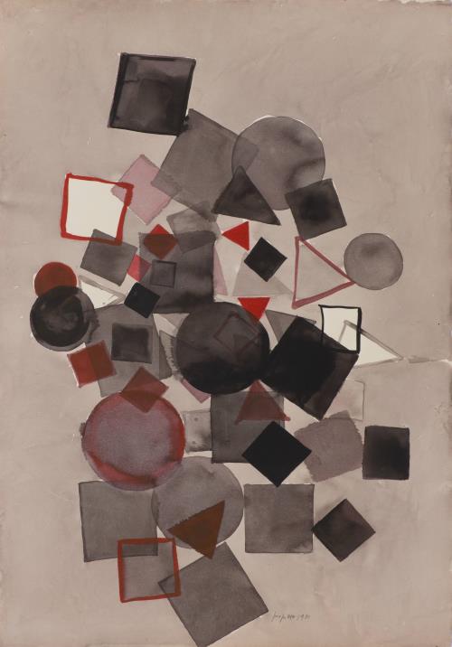 Pia PIZZO (1937-2021), "Esercizio", Composition sur champ rouge, gouache