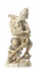 JAPON - Okimono en ivoire, pêcheur accompagné d'un enfant