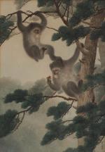 JAPON - "Singes dans les pins", Aquarelle, Epoque Meiji